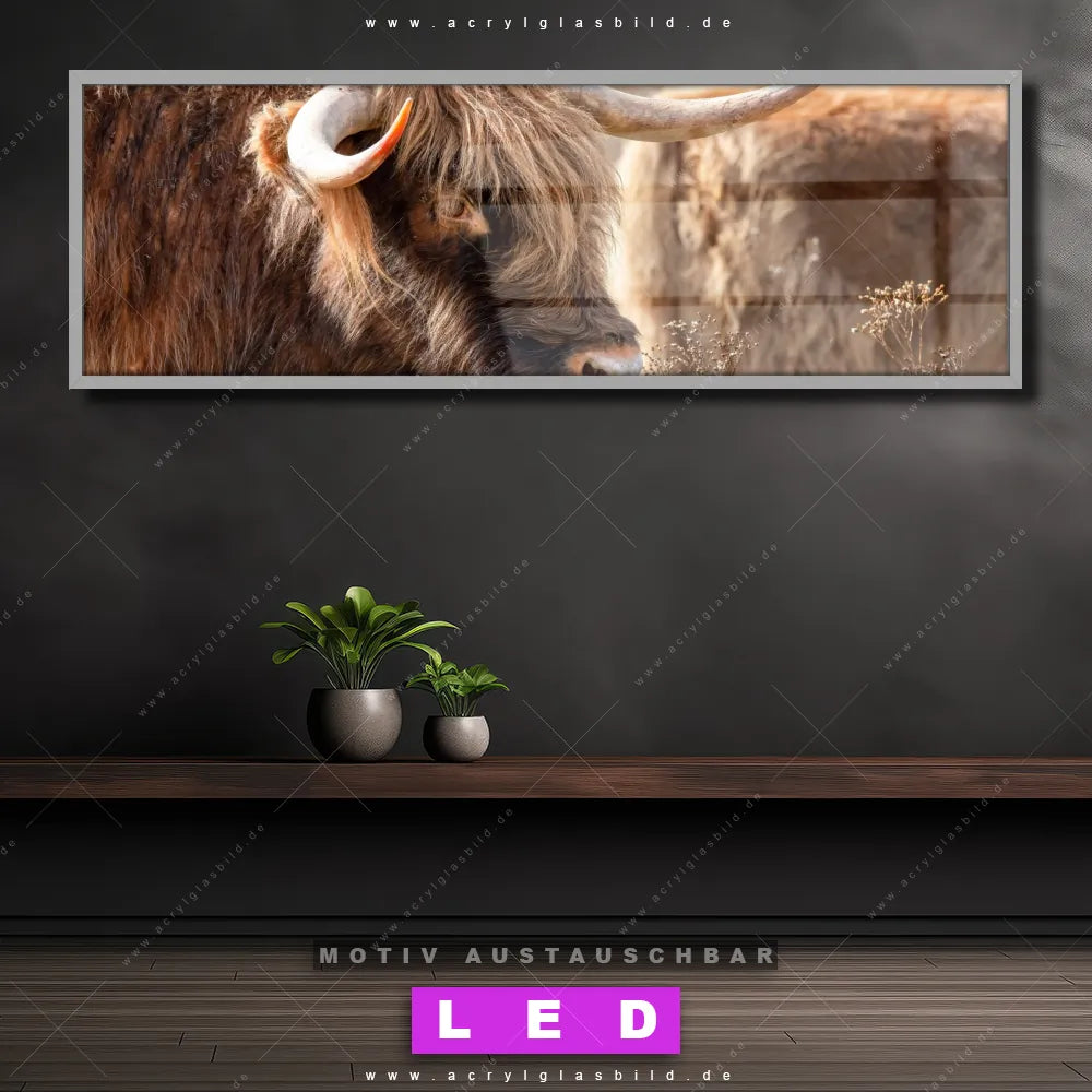 LED Acrylglasbild Canvalight® DIA | Hochlandrind auf Weide | Panorama