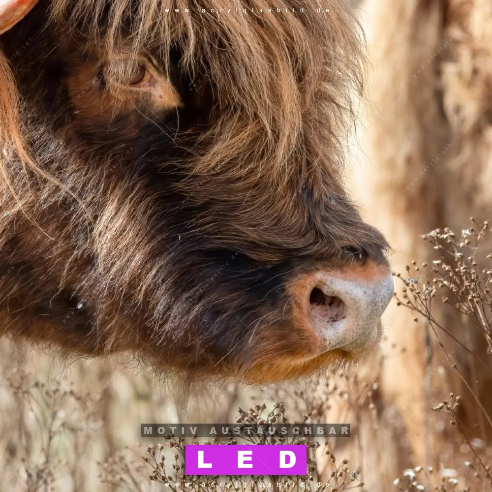 Also, worauf wartest du noch? Verwandle deine Wände mit einem LED Leuchtbild in wahre Kunstwerke und bestelle jetzt das Canvalight® DIA LED Acrylglasbild Porträt eines Hochland-Rindes. Deine Wände werden strahlen, und deine Freunde werden dank der wechselbaren Motive staunen!