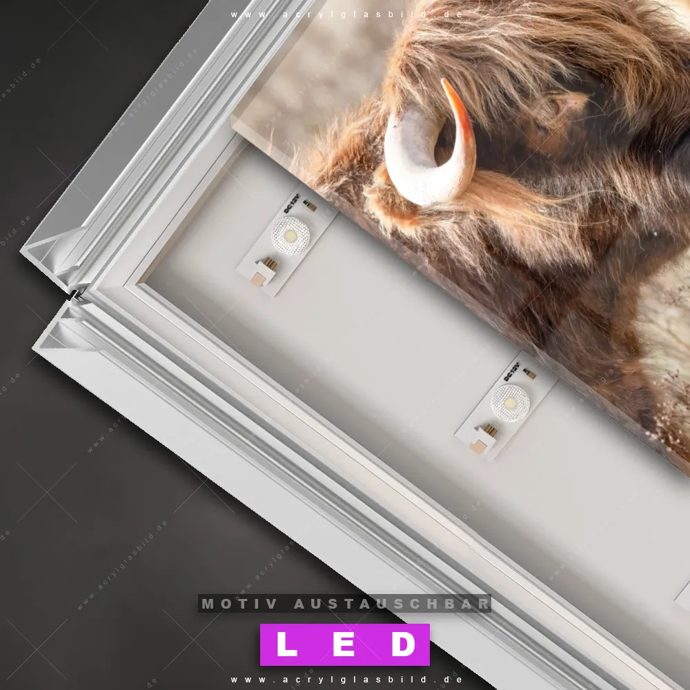 Also, worauf wartest du noch? Gib mit einem beleuchteten Wandbild mit wechselbarer Acrylglas-Scheibe deinen Wänden das gewisse Etwas und bestelle jetzt das LED Acrylglasbild Canvalight® DIA Porträt eines Hochland-Rindes – dein Zuhause wird es dir danken und deine Freunde werden dank der wechselbaren Motive erblassen!