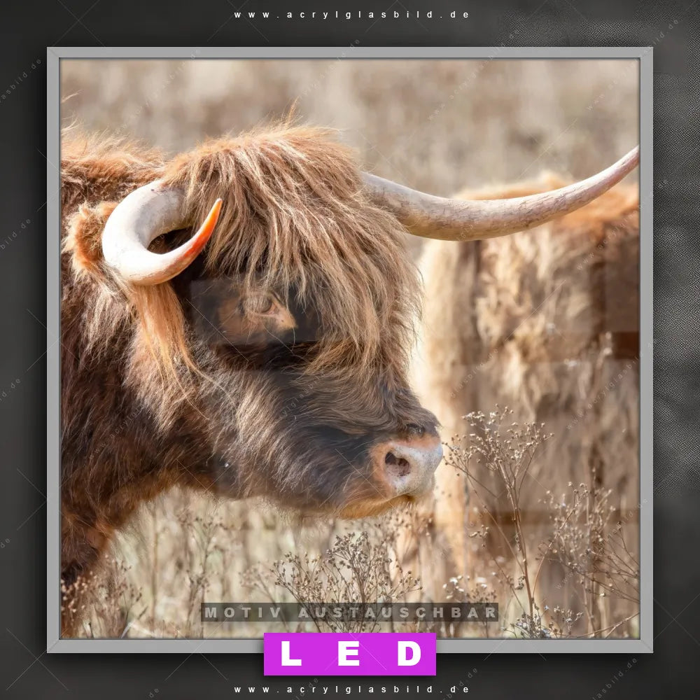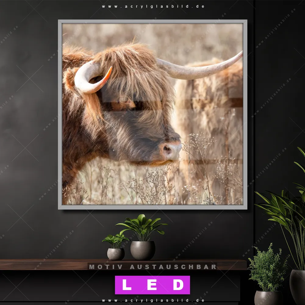 Bist du bereit, deine Wände mit einem dimmbaren LED Bild mit Fernbedienung und optionaler Farbtemperatursteuerung zum Leuchten zu bringen? Wir haben das ultimative Tierwelt LED Acrylglasbild Canvalight® DIA für dich! Unser LED Wandbild aus Acrylglas Hochlandrind auf Weide im Quadratischen Format mit austauschbarer bedruckter Acrylglas-Scheibe im DIA-Klapprahmen bringt sofort jede Menge Glanz in deine vier Wände.