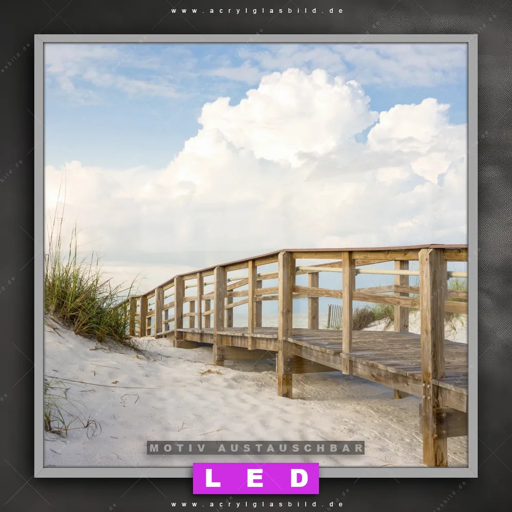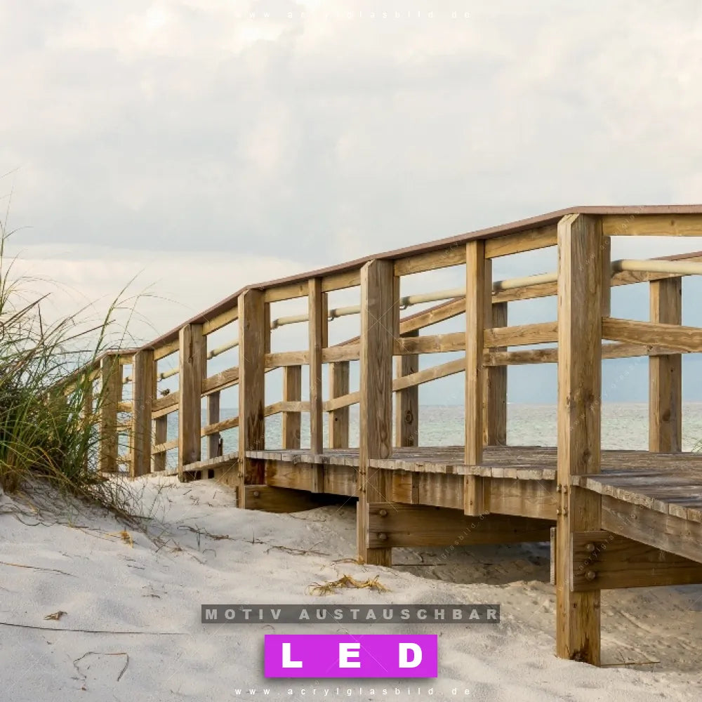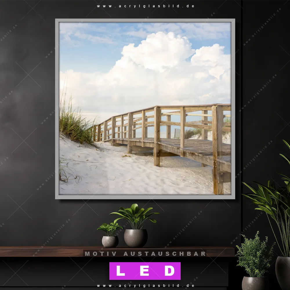 Bist du bereit, deine Wände mit einem dimmbaren LED Bild mit Fernbedienung und optionaler Farbtemperatursteuerung zum Leuchten zu bringen? Wir haben das ultimative Landschaften, Strand - Meer LED Acrylglasbild Canvalight® DIA für dich! Unser LED Wandbild aus Acrylglas Holzsteg & Dünen im Quadratischen Format mit austauschbarer bedruckter Acrylglas-Scheibe im DIA-Klapprahmen bringt sofort jede Menge Glanz in deine vier Wände.