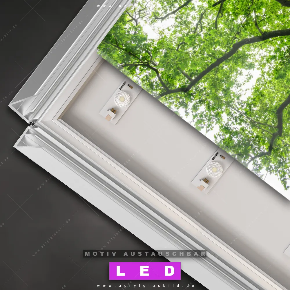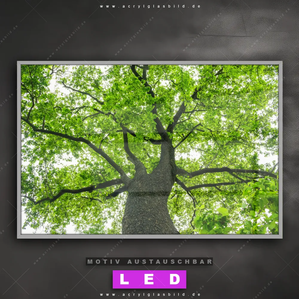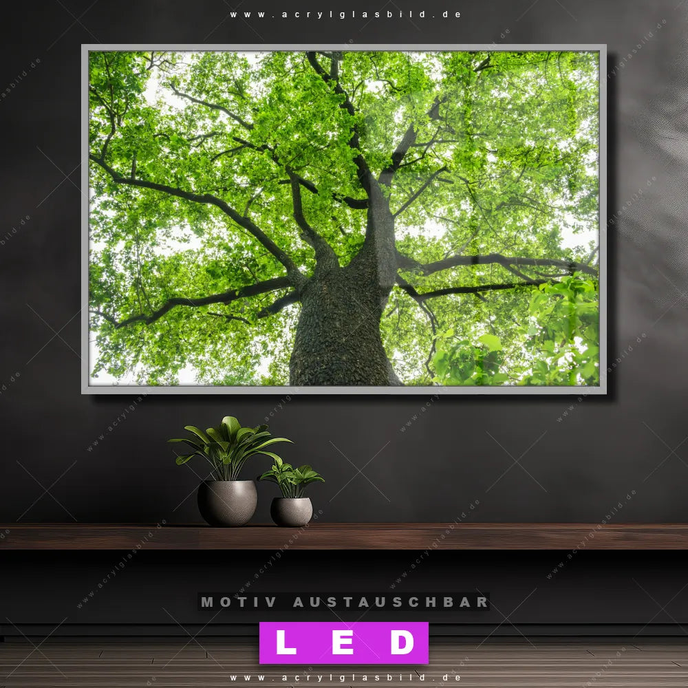 Du bist auf der Suche nach einem dimmbaren Landschaften, Wald - Bäume LED Bild mit Fernbedienung und optionaler Farbtemperatursteuerung? Dann haben wir hier genau das richtige Wandbild mit LED Beleuchtung für dich: Unser Canvalight® DIA LED Acrylglasbild Imposanter Baum im Querformat mit austauschbarer bedruckter Acrylglas-Scheibe. Dieses Leuchtbild bringt sofort Partybeleuchtung in deine Räume!