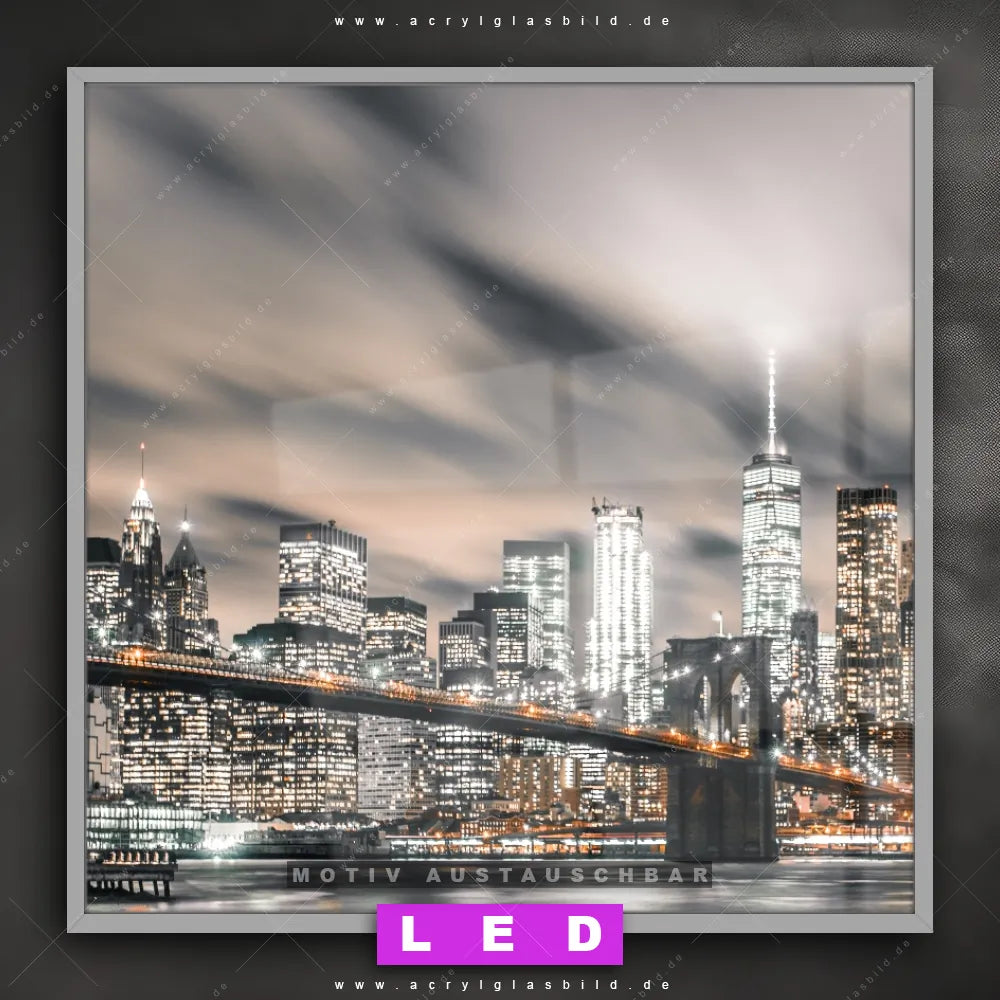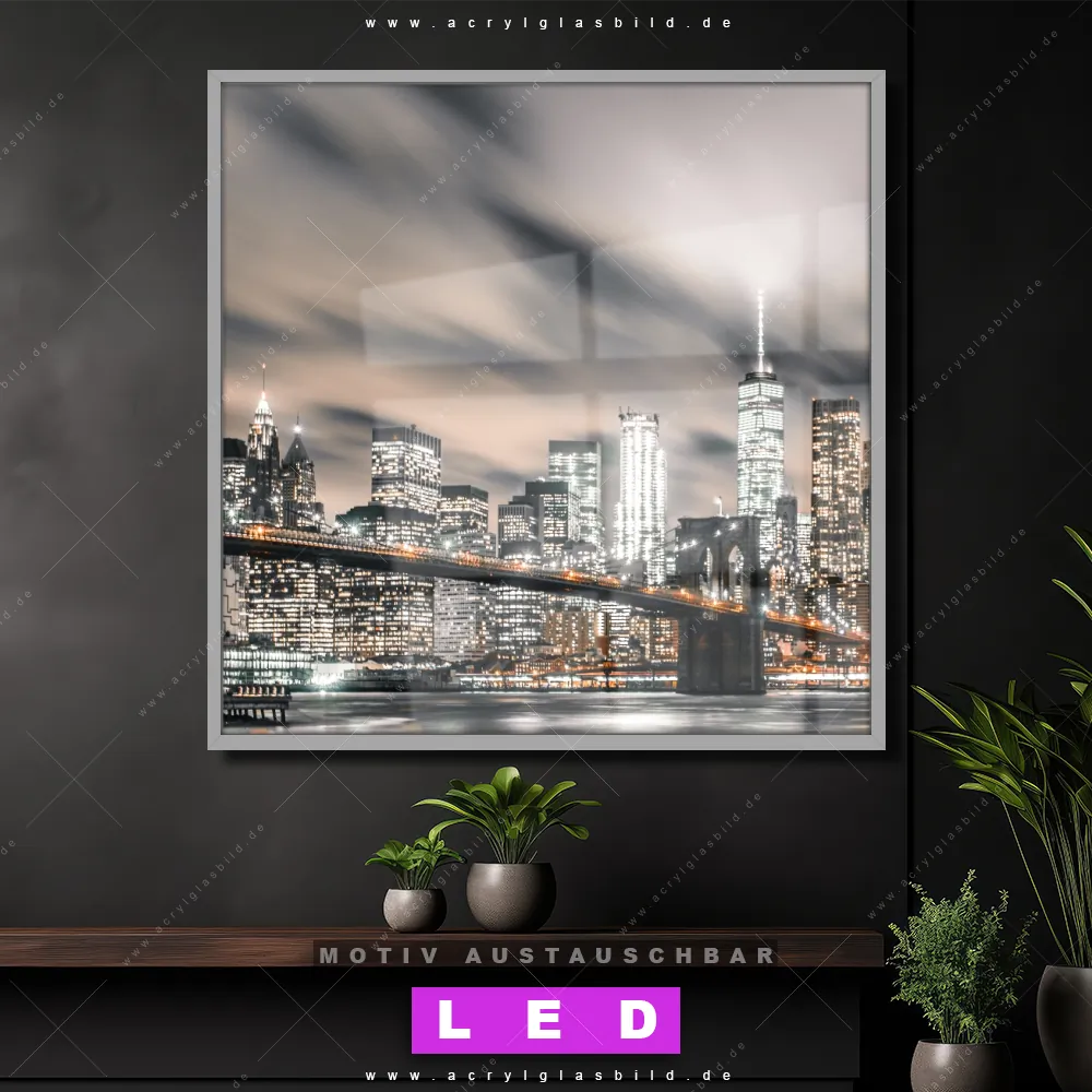 Also, worauf wartest du noch? Gib mit einem beleuchteten Wandbild mit wechselbarer Acrylglas-Scheibe deinen Wänden das gewisse Etwas und bestelle jetzt das LED Acrylglasbild Canvalight® DIA Manhatten in der Nacht – dein Zuhause wird es dir danken und deine Freunde werden dank der wechselbaren Motive erblassen!