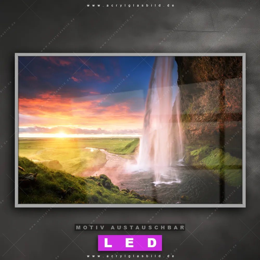 Du bist auf der Suche nach einem dimmbaren Landschaften LED Bild mit Fernbedienung und optionaler Farbtemperatursteuerung? Dann haben wir hier genau das richtige Wandbild mit LED Beleuchtung für dich: Unser Canvalight® DIA LED Acrylglasbild Isländischer Wasserfall im Querformat mit austauschbarer bedruckter Acrylglas-Scheibe. Dieses Leuchtbild bringt sofort Partybeleuchtung in deine Räume!