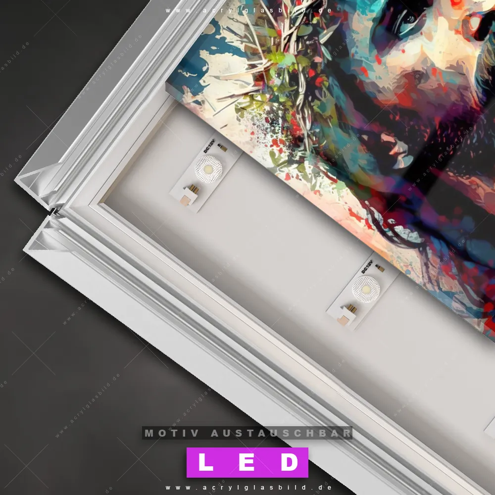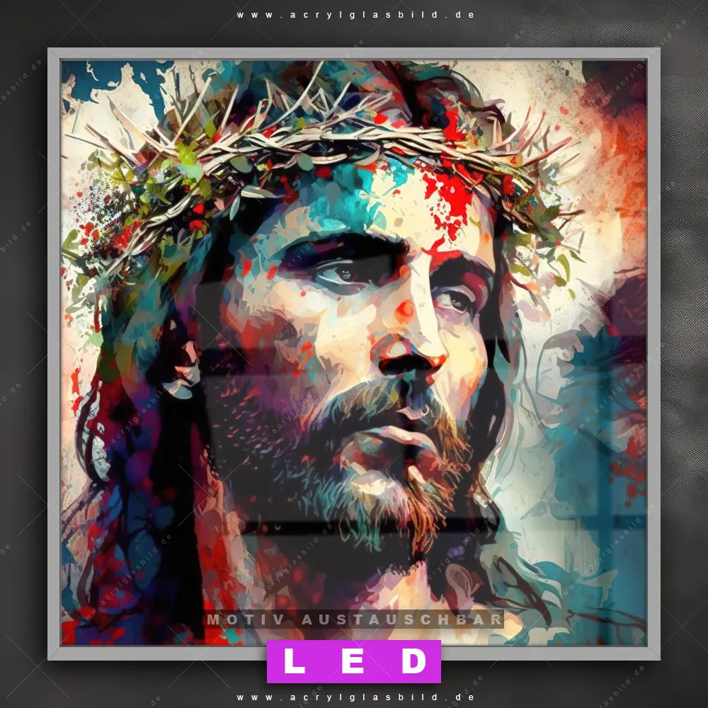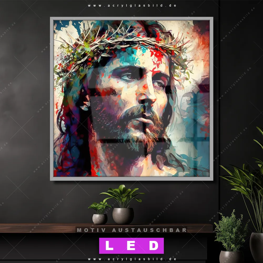 Bist du bereit, deine Wände mit einem dimmbaren LED Bild mit Fernbedienung und optionaler Farbtemperatursteuerung zum Leuchten zu bringen? Wir haben das ultimative Porträts - Menschen LED Acrylglasbild Canvalight® DIA für dich! Unser LED Wandbild aus Acrylglas Jesus Christus mit Dornenkrone im Quadratischen Format mit austauschbarer bedruckter Acrylglas-Scheibe im DIA-Klapprahmen bringt sofort jede Menge Glanz in deine vier Wände.