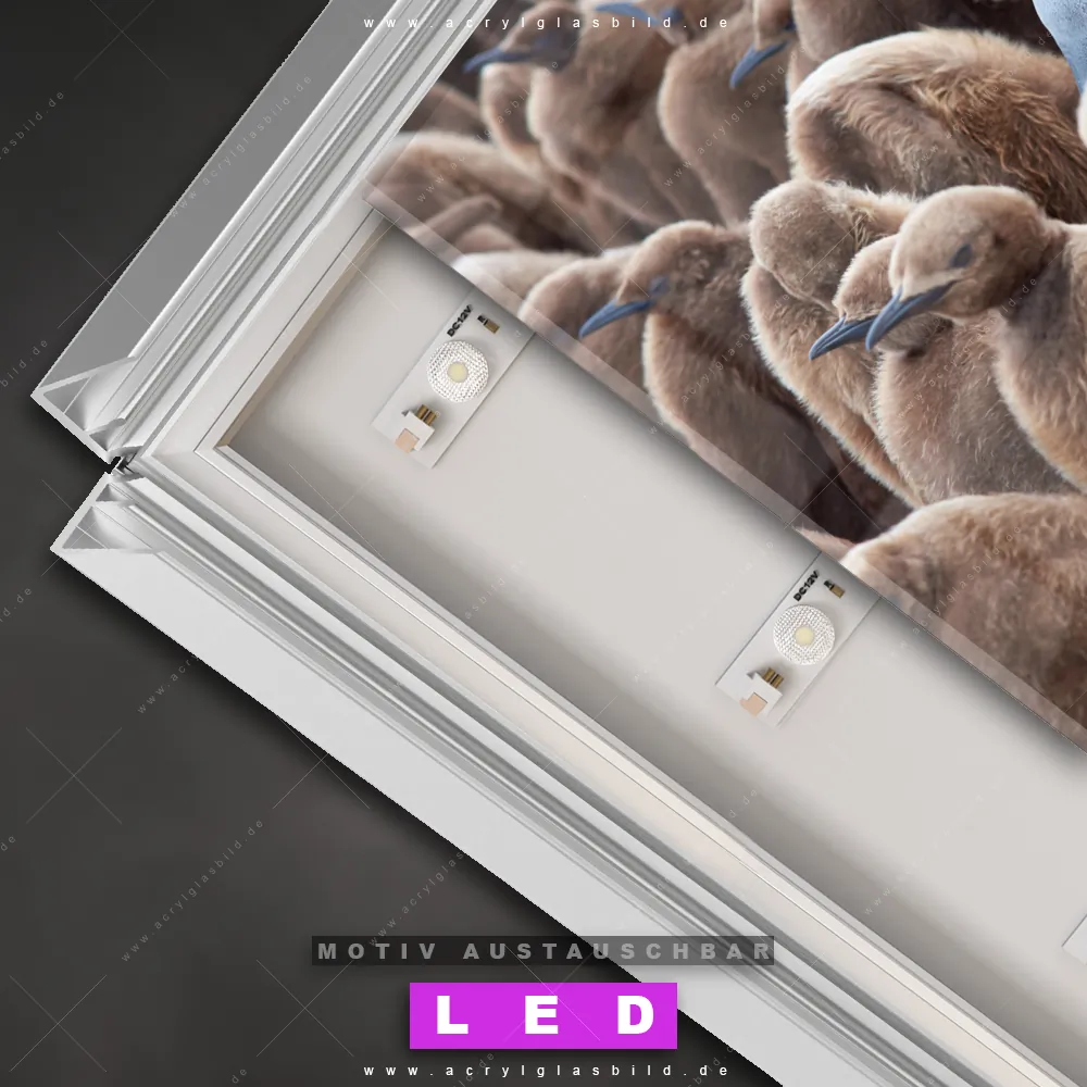Also, worauf wartest du noch? Gib mit einem beleuchteten Wandbild mit wechselbarer Acrylglas-Scheibe deinen Wänden das gewisse Etwas und bestelle jetzt das LED Acrylglasbild Canvalight® DIA Baby Pinguine – dein Zuhause wird es dir danken und deine Freunde werden dank der wechselbaren Motive erblassen!