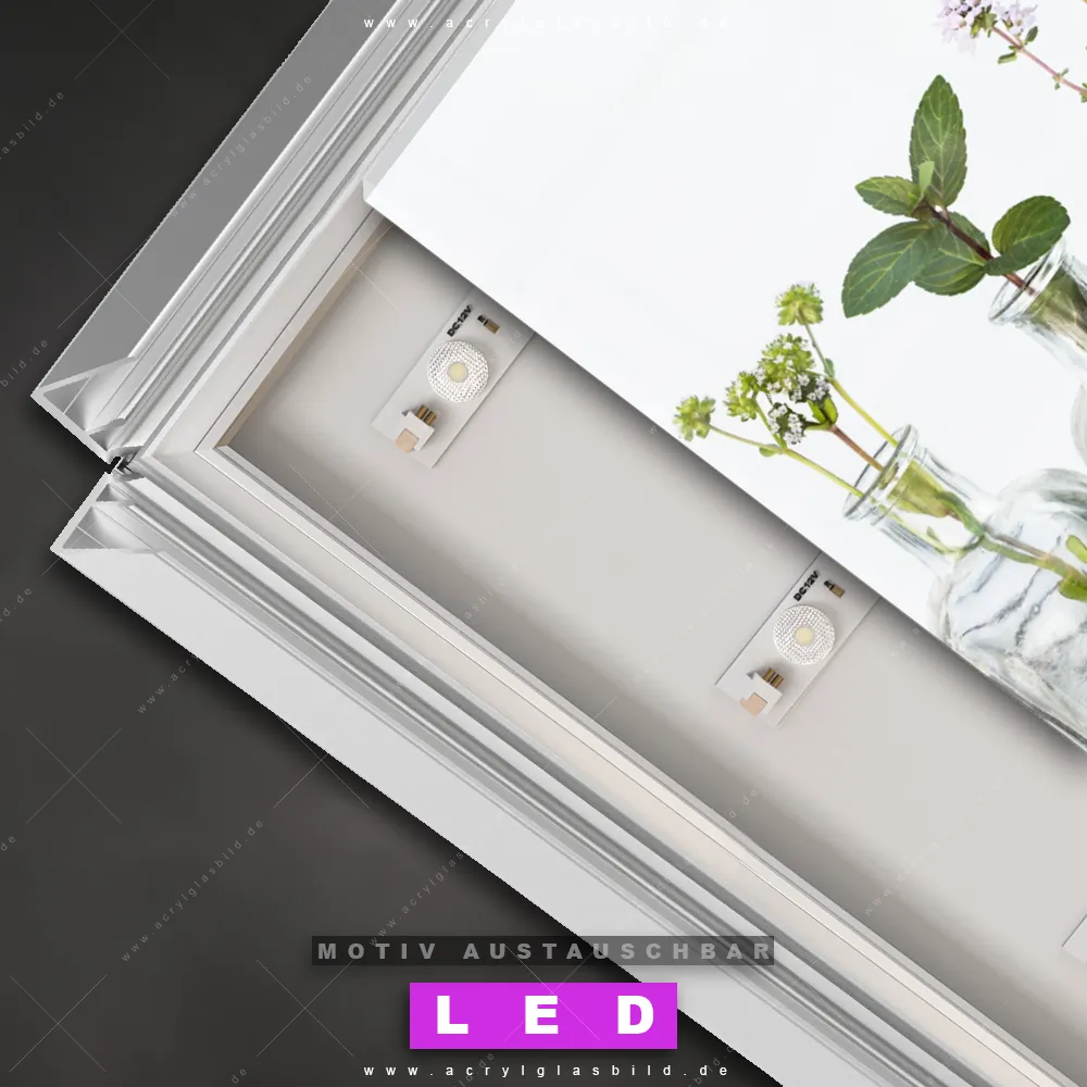 Du bist auf der Suche nach einem dimmbaren Essen - Trinken LED Bild mit Fernbedienung und optionaler Farbtemperatursteuerung? Dann haben wir hier genau das richtige Wandbild mit LED Beleuchtung für dich: Unser Canvalight® DIA LED Acrylglasbild Kräuter in Flaschen im Querformat mit austauschbarer bedruckter Acrylglas-Scheibe. Dieses Leuchtbild bringt sofort Partybeleuchtung in deine Räume!