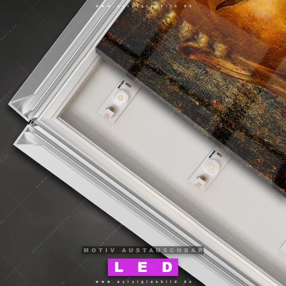 Also, worauf wartest du noch? Gib mit einem beleuchteten Wandbild mit wechselbarer Acrylglas-Scheibe deinen Wänden das gewisse Etwas und bestelle jetzt das LED Acrylglasbild Canvalight® DIA Buddha in Gold-Tönen – dein Zuhause wird es dir danken und deine Freunde werden dank der wechselbaren Motive erblassen!