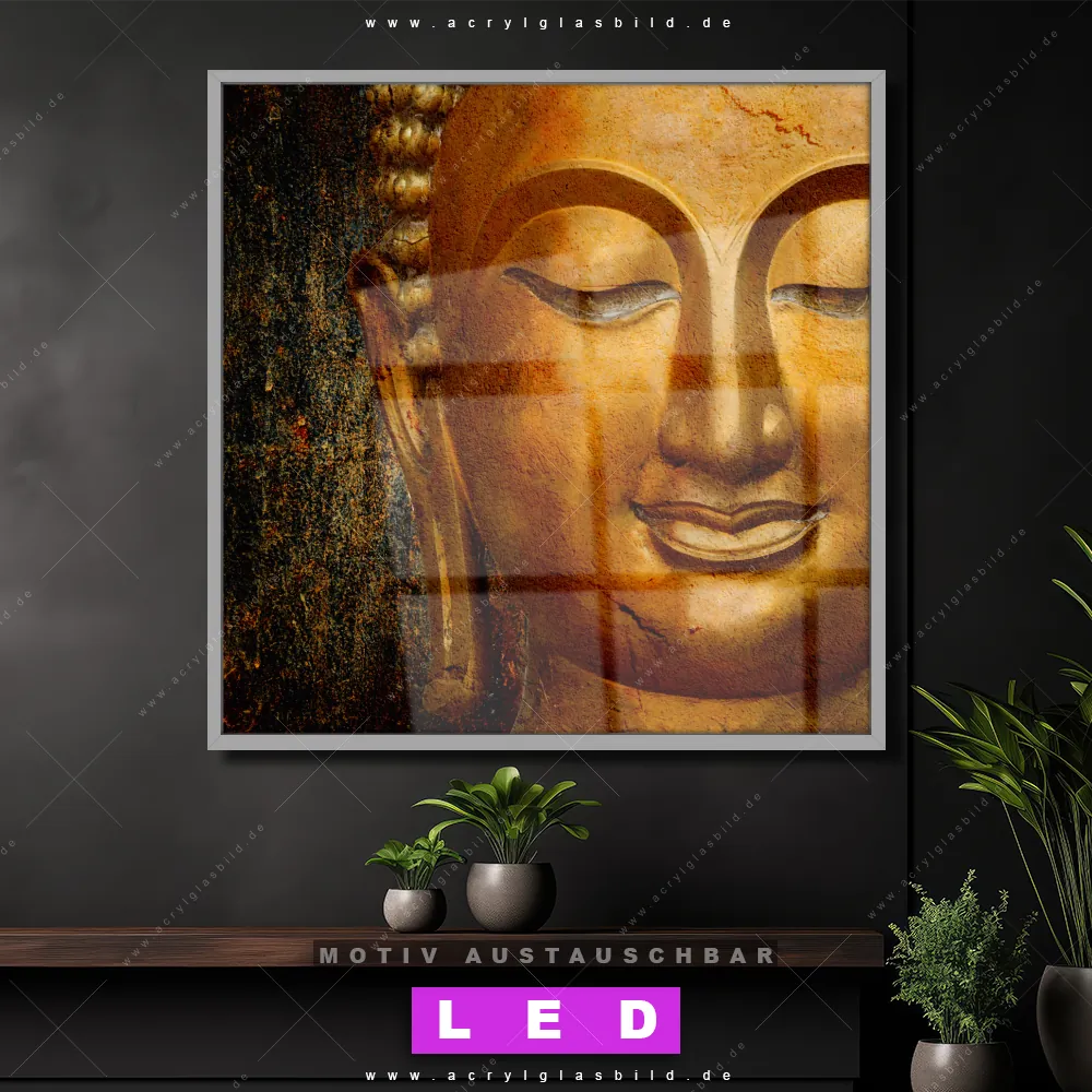 Bist du bereit, deine Wände mit einem dimmbaren LED Bild mit Fernbedienung und optionaler Farbtemperatursteuerung zum Leuchten zu bringen? Wir haben das ultimative Buddha - Feng Shui LED Acrylglasbild Canvalight® DIA für dich! Unser LED Wandbild aus Acrylglas Lächelnder Buddha in Gold im Quadratischen Format mit austauschbarer bedruckter Acrylglas-Scheibe im DIA-Klapprahmen bringt sofort jede Menge Glanz in deine vier Wände.