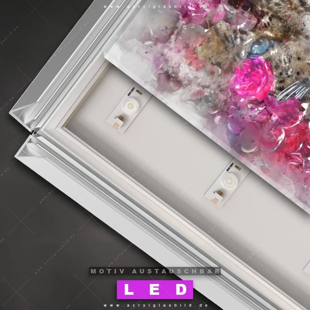Wer braucht schon langweilige Wände, wenn man sie mit unserem LED Acrylglasbild Canvalight® DIA Leopard umhüllt von aquarellierten Blüten aufpeppen kann? Dank der genialen LED-Ausleuchtung wirst du in Wohnzimmer - Schlafzimmer, Arzt - Praxis, Bar - Gastronomie, Büro - Kanzlei, Flur - Eingangsbereich nie wieder über deine eigenen Füße stolpern. Wenn du nach einem beleuchteten Wandbild aus Acrylglas mit Tiere & Blumen, Tier, Blumen, Leopard, Kunst, Aquarell, Jaguar, Gepard, Raubkatze, Blüten, Rosen suchst, dann ist unser LED Acrylglasbild Leopardenblick im Blumenmeer in den hammermäßigen Motiv-Farben Rosa, Pink, Beige genau das richtige LED Bild für dich. Im coolen Floral, Modern Art Stil gestaltet, passt das LED Leuchtbild mit DIA-Klapprahmen und glänzender Front aus Acrylglas perfekt zu jedem Einrichtungsstil – sogar zu deinem chaotischen Kreativlabor!