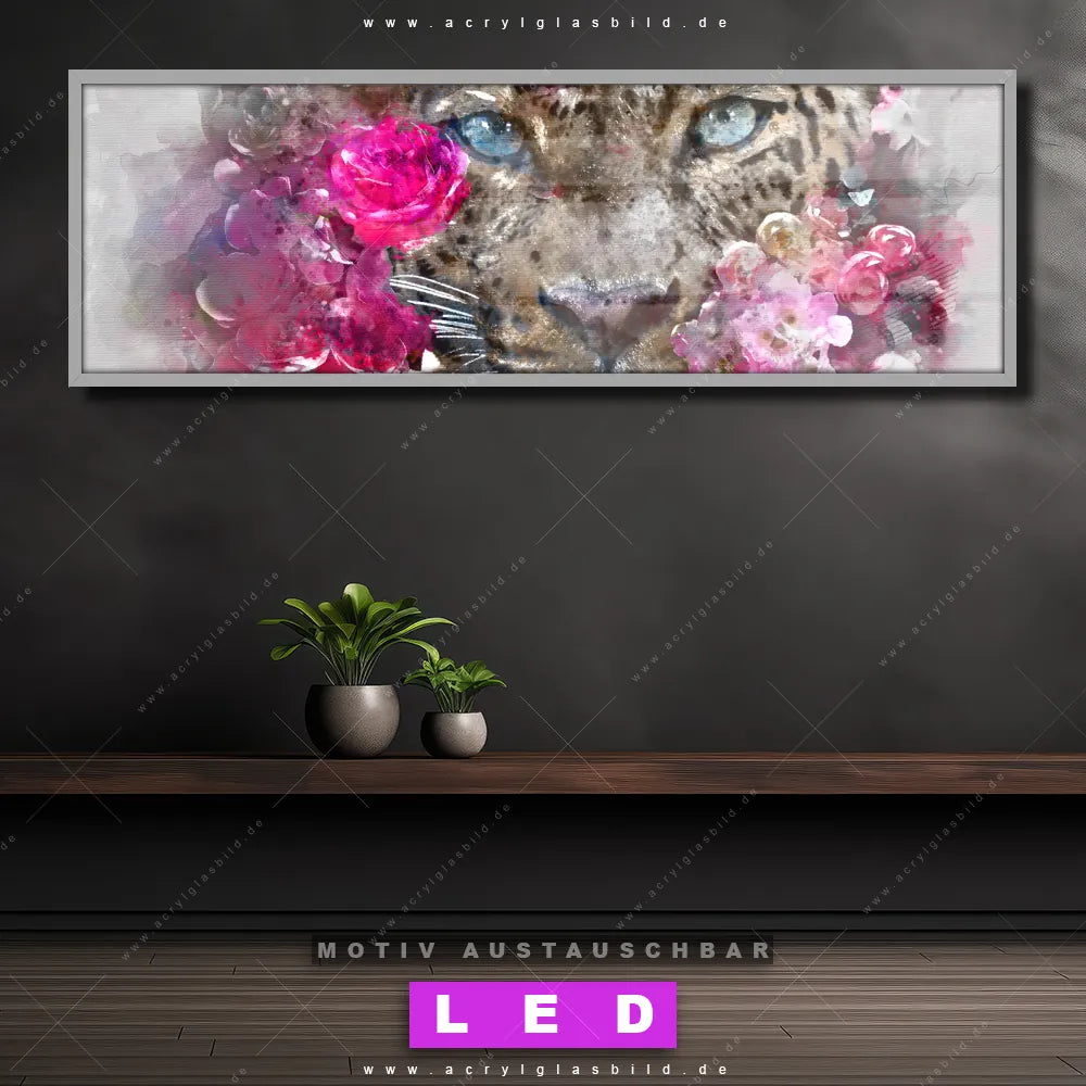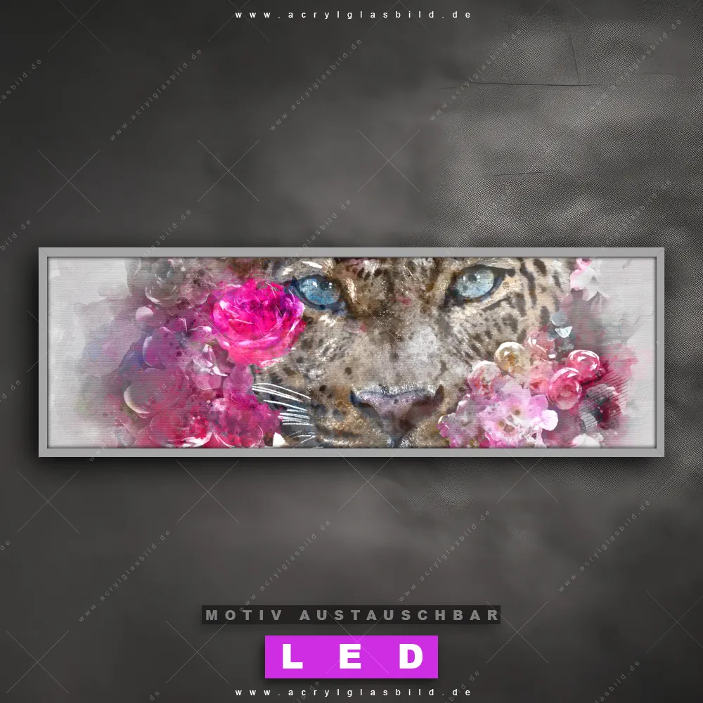 Deine Wände könnten dringend ein dimmbares LED Bild mit Fernbedienung und optionaler Farbtemperatursteuerung gebrauchen? Dann haben wir das perfekte Wandbild mit LED Beleuchtung für dich: unser mega-cooles Tierwelt, Blumen - Botanik Canvalight® DIA LED Acrylglasbild! Mit unserem angesagten Leuchtbild aus Acrylglas im Panorama-Format und der austauschbaren bedruckten Acrylglas-Scheibe Leopard & Blumen bringst du nicht nur Licht, sondern auch jede Menge Flair in deine Räume.