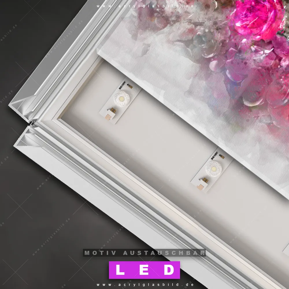 Mit unserem LED Acrylglasbild Canvalight® DIA Leopard umhüllt von aquarellierten Blüten und seiner genialen LED-Ausleuchtung wirst du nie wieder im Dunkeln auf deinem Sofa herumtappen. Wenn du nach einem beleuchteten Wandbild aus Acrylglas mit Tiere & Blumen, Tier, Blumen, Leopard, Kunst, Aquarell, Jaguar, Gepard, Raubkatze, Blüten, Rosen für Wohnzimmer - Schlafzimmer, Arzt - Praxis, Bar - Gastronomie, Büro - Kanzlei, Flur - Eingangsbereich suchst, ist unser LED Leuchtbild Leopardenblick im Blumenmeer in den beeindruckenden Motiv-Farben Rosa, Pink, Beige genau das richtige beleuchtete Wandbild für dich. Gestaltet im Floral, Modern Art Stil, passt dieses LED Wandbild mit DIA-Klapprahmen und glänzender Front aus Acrylglas perfekt zu jedem Einrichtungsstil – sogar zu deinem chaotischen kreativen Durcheinander!