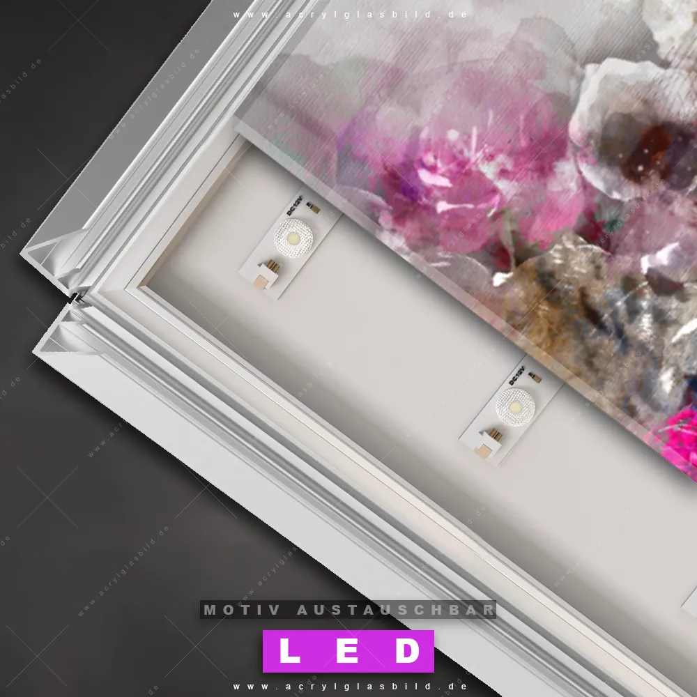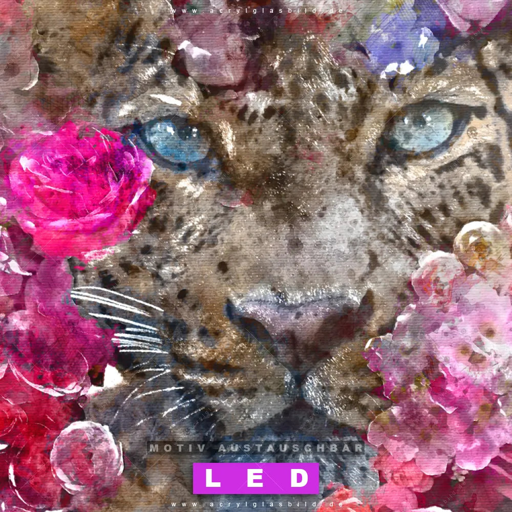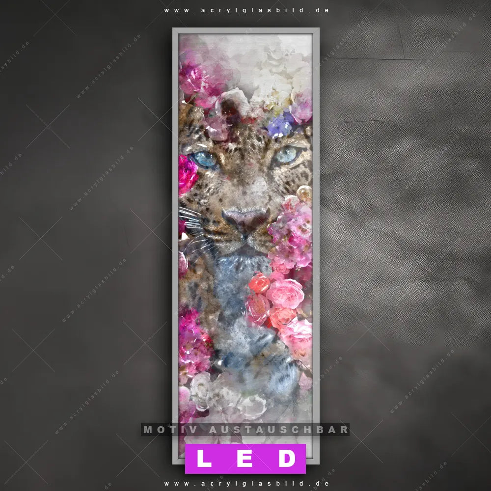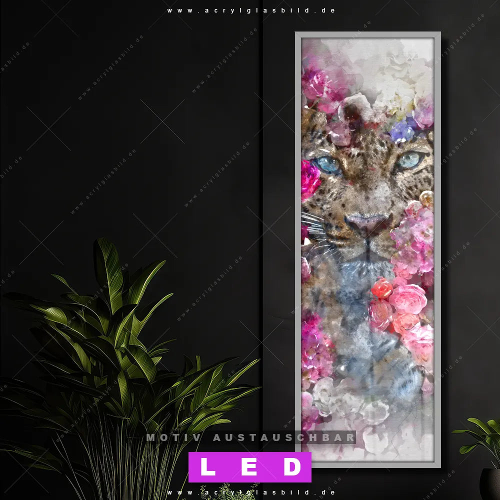 Bist du bereit, deine Wände mit einem dimmbaren LED Bild mit Fernbedienung und optionaler Farbtemperatursteuerung auf das nächste Level zu bringen? Unser Tierwelt, Blumen - Botanik Canvalight® DIA LED Acrylglasbild ist genau das, was du brauchst! Das Wandbild mit LED Beleuchtung im Schmalen Format mit austauschbarer bedruckter Acrylglas-Scheibe Leopard & Blumen bringt Licht und Stil in dein Zuhause – und das in null Komma nichts!