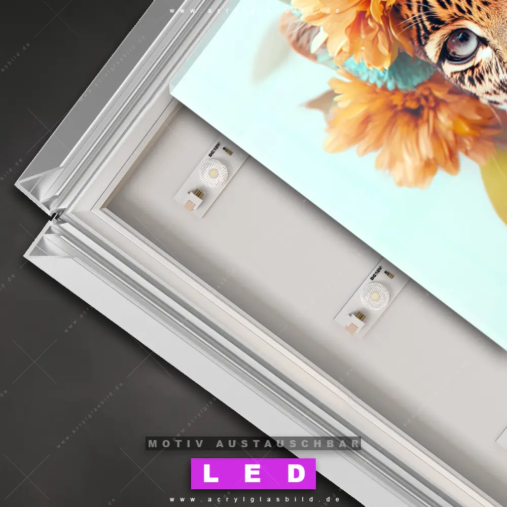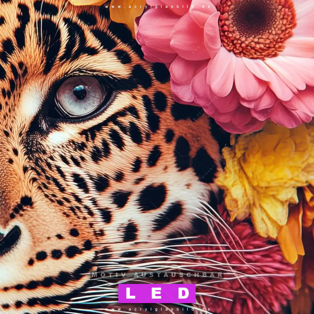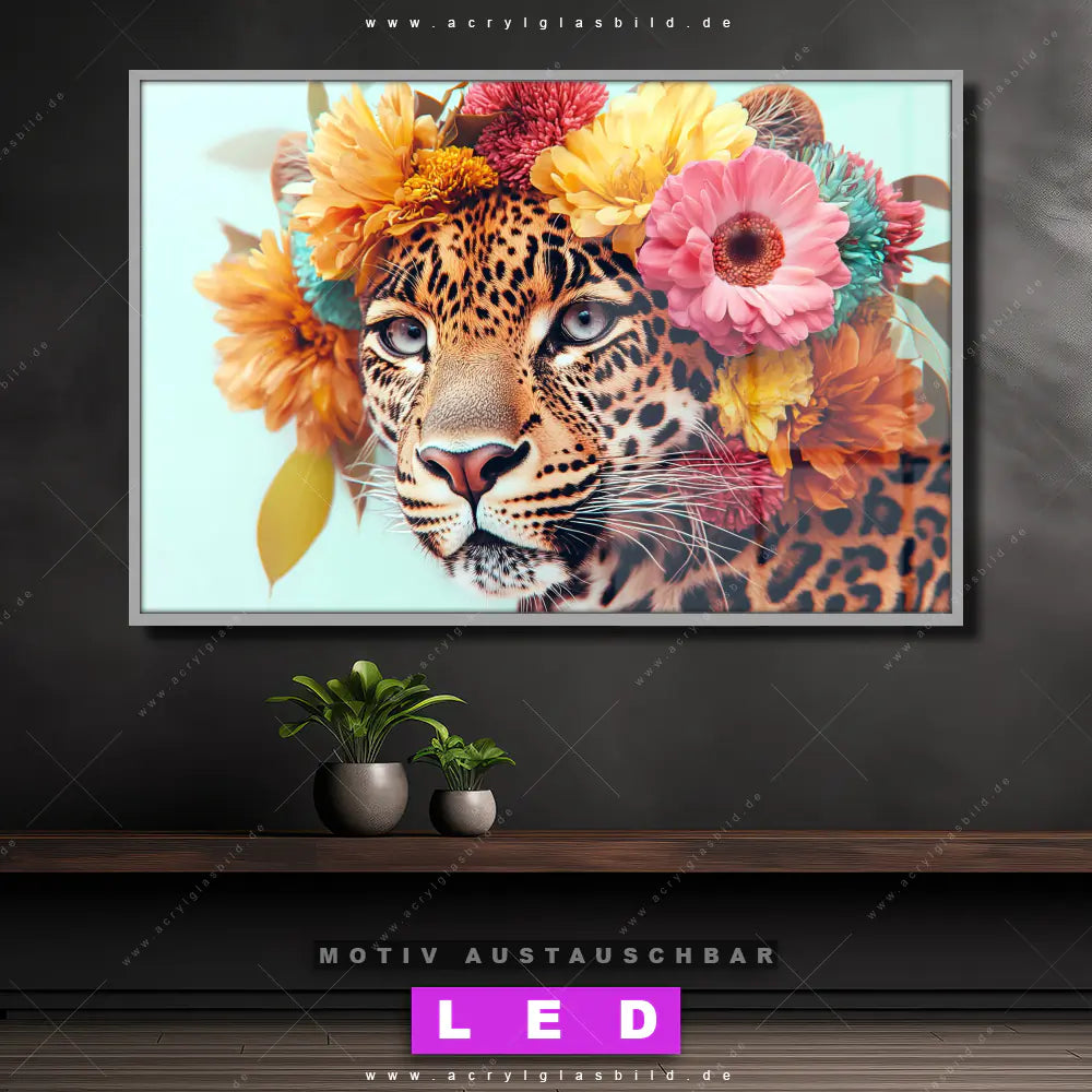 Du bist auf der Suche nach einem dimmbaren Tierwelt, Blumen - Botanik LED Bild mit Fernbedienung und optionaler Farbtemperatursteuerung? Dann haben wir hier genau das richtige Wandbild mit LED Beleuchtung für dich: Unser Canvalight® DIA LED Acrylglasbild Leopard mit Blütenkranz im Querformat mit austauschbarer bedruckter Acrylglas-Scheibe. Dieses Leuchtbild bringt sofort Partybeleuchtung in deine Räume!