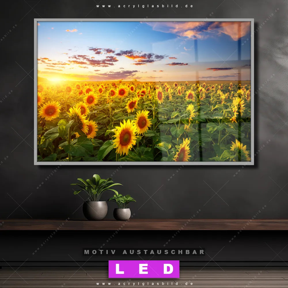 Du bist auf der Suche nach einem dimmbaren Landschaften, Blumen - Botanik LED Bild mit Fernbedienung und optionaler Farbtemperatursteuerung? Dann haben wir hier genau das richtige Wandbild mit LED Beleuchtung für dich: Unser Canvalight® DIA LED Acrylglasbild Leuchtend gelbe Sonnenblumen am Abend im Querformat mit austauschbarer bedruckter Acrylglas-Scheibe. Dieses Leuchtbild bringt sofort Partybeleuchtung in deine Räume!