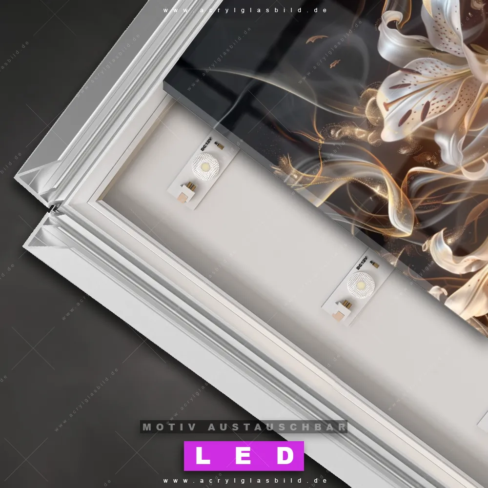 Du suchst nach einem Wandbild mit LED Beleuchtung als ultimativen Hingucker für deine Wände? Dann haben wir das perfekte dimmbare LED Bild mit Fernbedienung und optionaler Farbtemperatursteuerung für dich: unser abgefahrenes Blumen - Botanik Canvalight® DIA LED Acrylglasbild! Mit dem LED Leuchtbild aus Acrylglas Lilien in goldenem Rauch im Hochformat mit austauschbarer bedruckter Acrylglas-Scheibe bringst du nicht nur Licht, sondern auch ordentlich Stil in deine Bude.