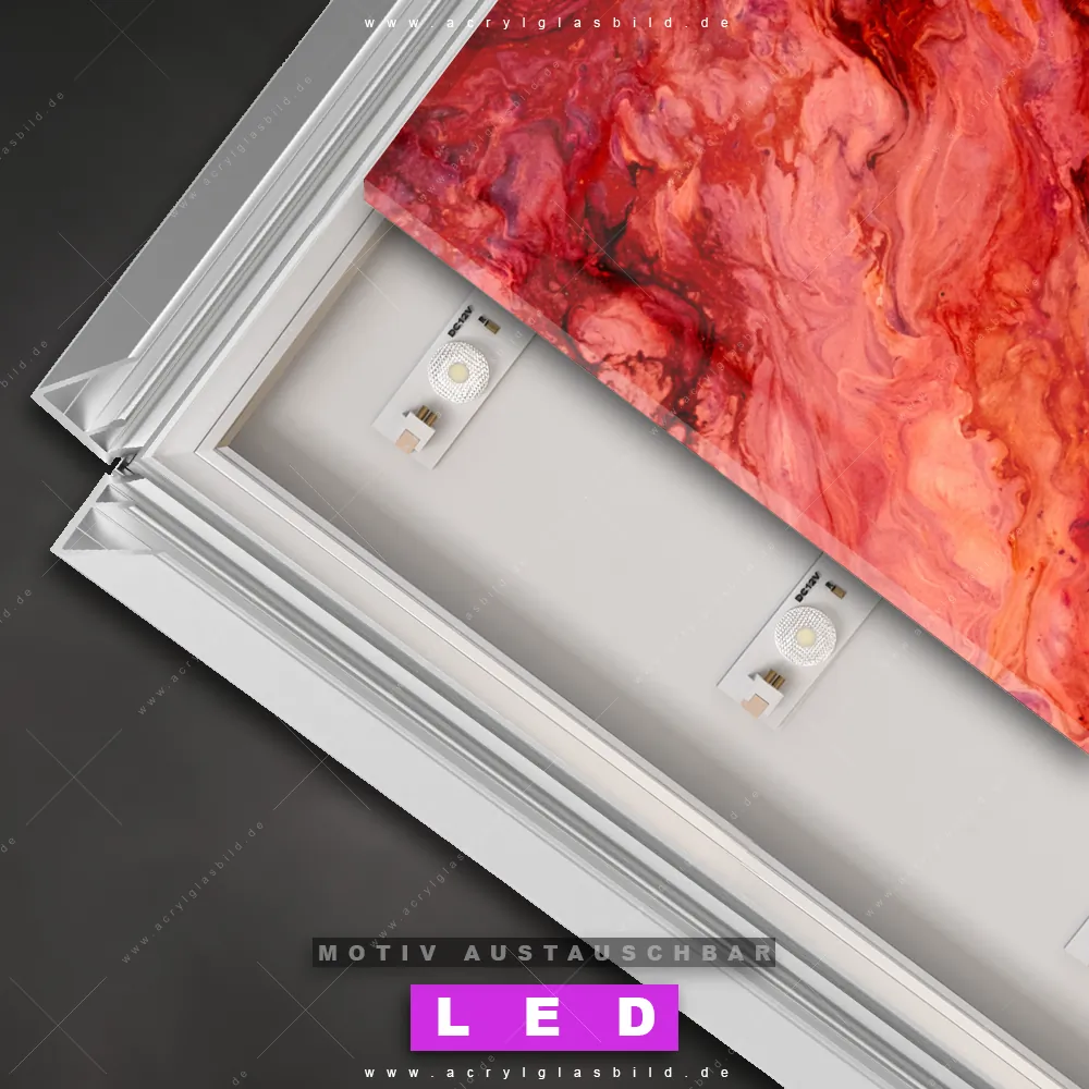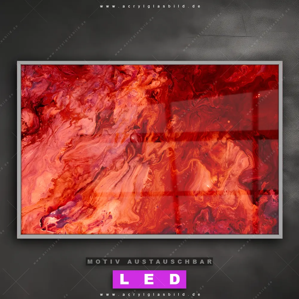 Du bist auf der Suche nach einem dimmbaren Muster - Texturen LED Bild mit Fernbedienung und optionaler Farbtemperatursteuerung? Dann haben wir hier genau das richtige Wandbild mit LED Beleuchtung für dich: Unser Canvalight® DIA LED Acrylglasbild Liquid Marmor rot im Querformat mit austauschbarer bedruckter Acrylglas-Scheibe. Dieses Leuchtbild bringt sofort Partybeleuchtung in deine Räume!