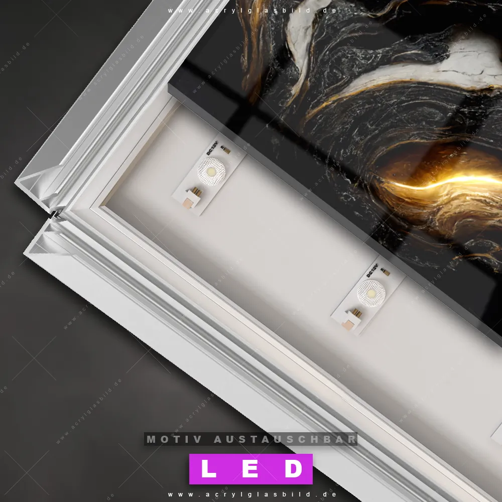 Wer braucht schon langweilige Wände, wenn man sie mit unserem LED Acrylglasbild Canvalight® DIA Liquid Painting Marmorlook aufpeppen kann? Dank der genialen LED-Ausleuchtung wirst du in Arzt - Praxis, Büro - Kanzlei, Wohnzimmer - Schlafzimmer, Bar - Gastronomie, Friseur - Beauty nie wieder über deine eigenen Füße stolpern. Wenn du nach einem beleuchteten Wandbild aus Acrylglas mit Marmor, Flüssigkeit, Acryl, flüssig, Farbe, Marmorierung, Fluid Art suchst, dann ist unser LED Acrylglasbild Fluid Art Marmordesign in den hammermäßigen Motiv-Farben Schwarz, Gold, Weiss genau das richtige LED Bild für dich. Im coolen Abstrakt, Modern Art Stil gestaltet, passt das LED Leuchtbild mit DIA-Klapprahmen und glänzender Front aus Acrylglas perfekt zu jedem Einrichtungsstil – sogar zu deinem chaotischen Kreativlabor!