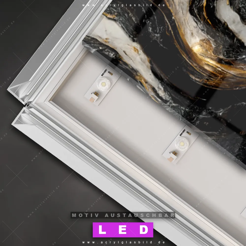 Wer will schon dunkle, triste Wände? Mit unserem LED Acrylglasbild Canvalight® DIA Liquid Painting Marmorlook und seiner fantastischen LED-Ausleuchtung werden deine Wände in Arzt - Praxis, Büro - Kanzlei, Wohnzimmer - Schlafzimmer, Bar - Gastronomie, Friseur - Beauty zu echten Hinguckern. Wenn du auf der Suche nach einem beleuchteten Wandbild aus Acrylglas mit Marmor, Flüssigkeit, Acryl, flüssig, Farbe, Marmorierung, Fluid Art bist, dann solltest du unser LED Leuchhtbild Fluid Art Marmordesign mit den beeindruckenden Motiv-Farben Schwarz, Gold, Weiss nicht verpassen. Gestaltet im angesagten Abstrakt, Modern Art Stil, passt das LED Bild mit DIA-Klapprahmen und wechselbarer Acrylglas-Scheibe perfekt zu jedem Einrichtungsstil – selbst in deinem kleinen Dschungel aus Kreativität und Chaos!