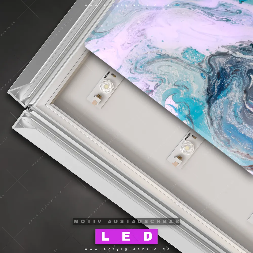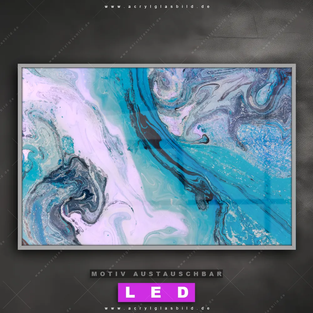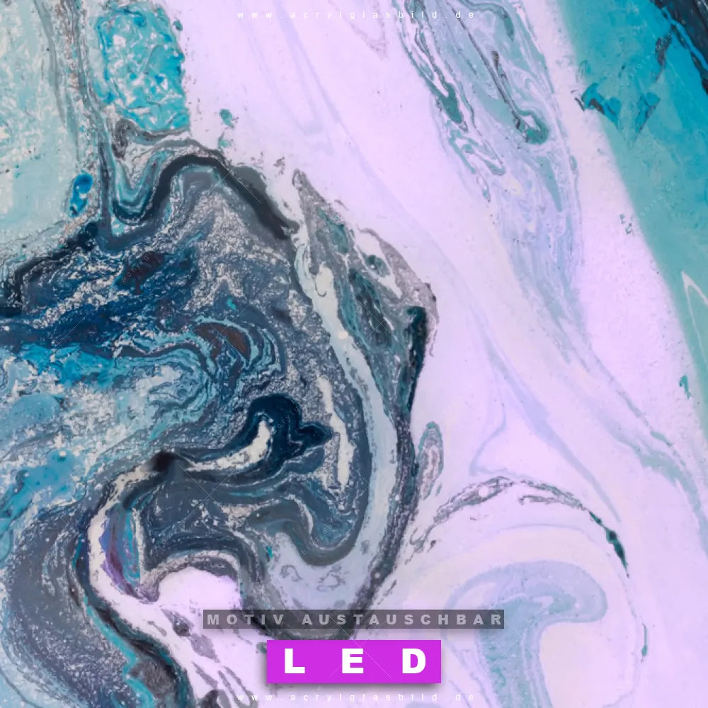 Du bist auf der Suche nach einem dimmbaren Muster - Texturen LED Bild mit Fernbedienung und optionaler Farbtemperatursteuerung? Dann haben wir hier genau das richtige Wandbild mit LED Beleuchtung für dich: Unser Canvalight® DIA LED Acrylglasbild Liquid Marmor Türkis Flieder im Querformat mit austauschbarer bedruckter Acrylglas-Scheibe. Dieses Leuchtbild bringt sofort Partybeleuchtung in deine Räume!