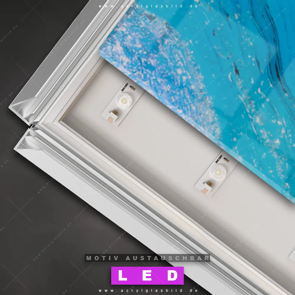 Bist du bereit, deine Wände mit einem dimmbaren LED Bild mit Fernbedienung und optionaler Farbtemperatursteuerung auf das nächste Level zu bringen? Unser Muster - Texturen Canvalight® DIA LED Acrylglasbild ist genau das, was du brauchst! Das Wandbild mit LED Beleuchtung im Schmalen Format mit austauschbarer bedruckter Acrylglas-Scheibe Liquid Marmor Türkis Flieder bringt Licht und Stil in dein Zuhause – und das in null Komma nichts!