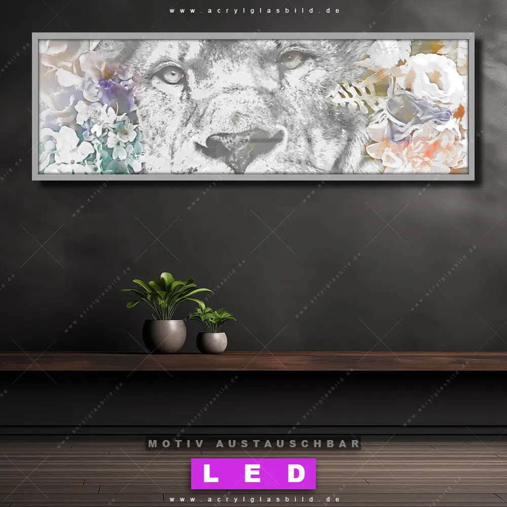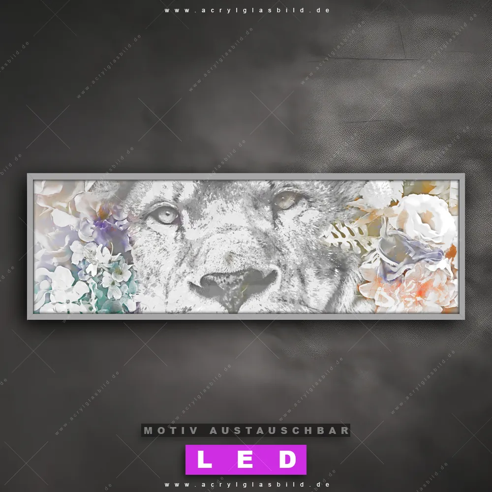 Deine Wände könnten dringend ein dimmbares LED Bild mit Fernbedienung und optionaler Farbtemperatursteuerung gebrauchen? Dann haben wir das perfekte Wandbild mit LED Beleuchtung für dich: unser mega-cooles Tierwelt, Blumen - Botanik Canvalight® DIA LED Acrylglasbild! Mit unserem angesagten Leuchtbild aus Acrylglas im Panorama-Format und der austauschbaren bedruckten Acrylglas-Scheibe Löwe & Blumen bringst du nicht nur Licht, sondern auch jede Menge Flair in deine Räume.