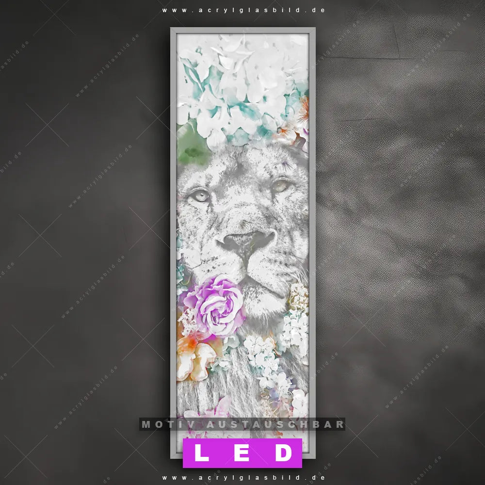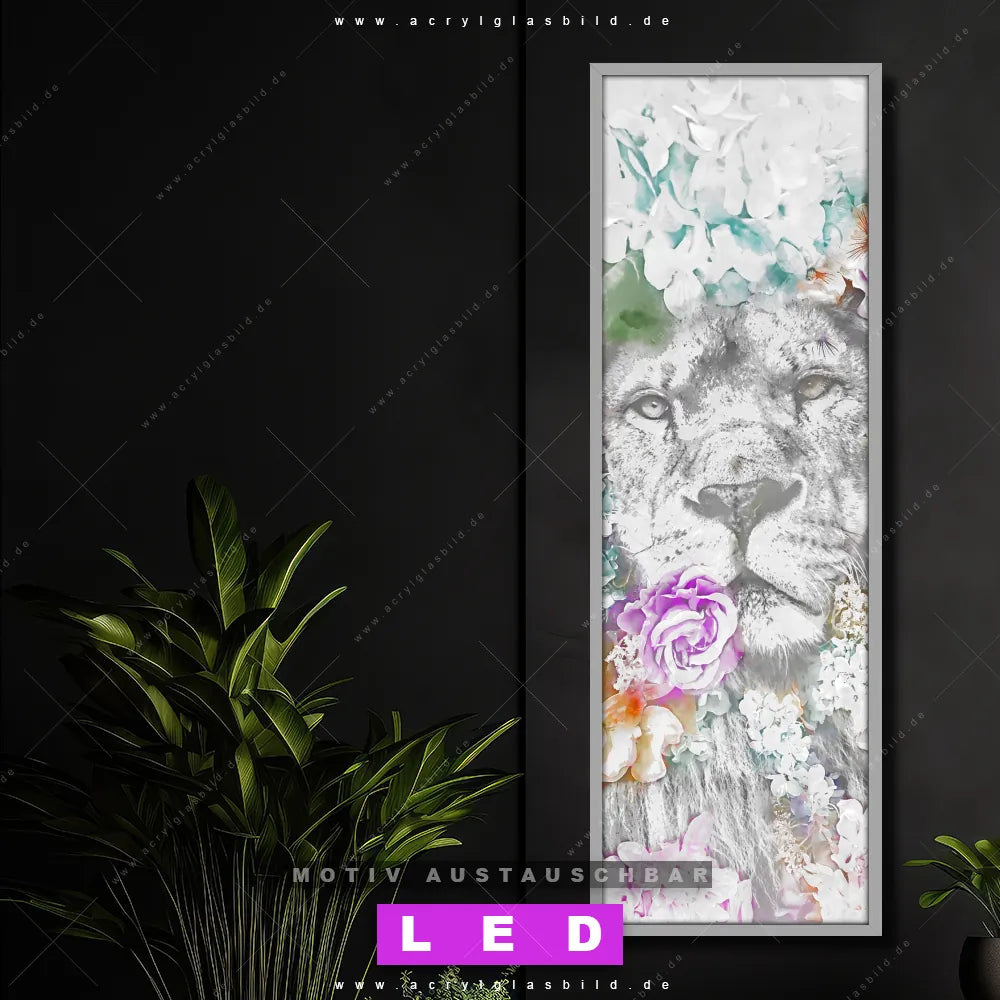 Bist du bereit, deine Wände mit einem dimmbaren LED Bild mit Fernbedienung und optionaler Farbtemperatursteuerung auf das nächste Level zu bringen? Unser Tierwelt, Blumen - Botanik Canvalight® DIA LED Acrylglasbild ist genau das, was du brauchst! Das Wandbild mit LED Beleuchtung im Schmalen Format mit austauschbarer bedruckter Acrylglas-Scheibe Löwe & Blumen bringt Licht und Stil in dein Zuhause – und das in null Komma nichts!