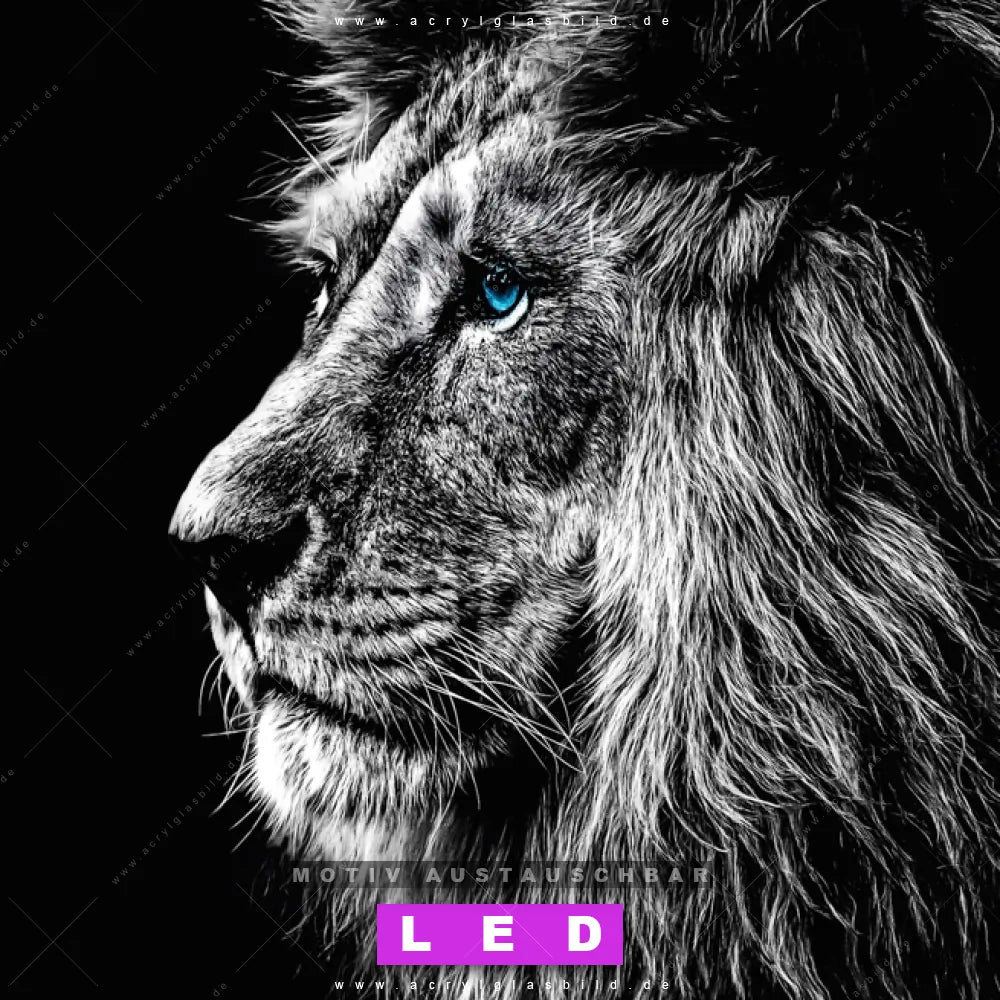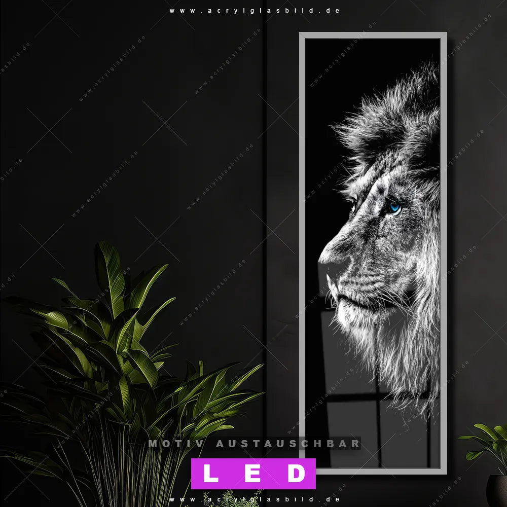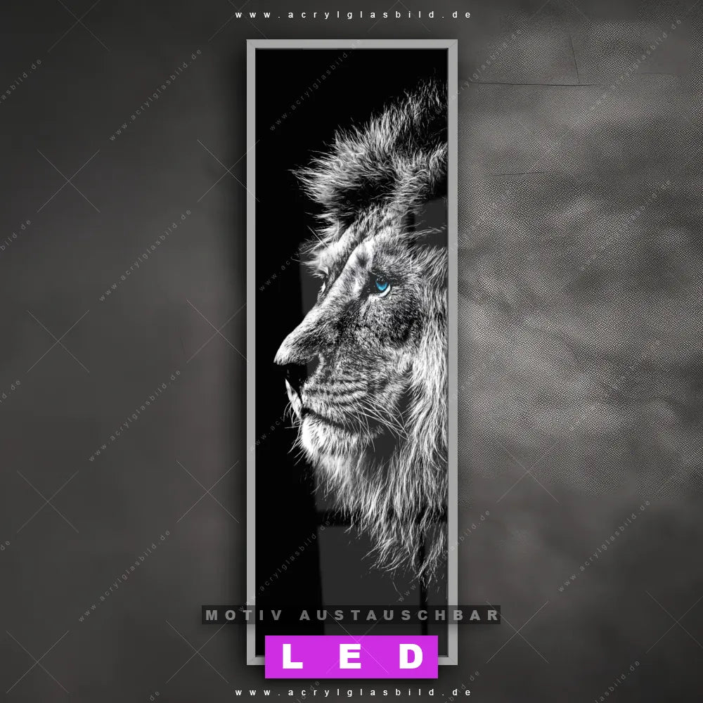 Bist du bereit, deine Wände mit einem dimmbaren LED Bild mit Fernbedienung und optionaler Farbtemperatursteuerung auf das nächste Level zu bringen? Unser Tierwelt Canvalight® DIA LED Acrylglasbild ist genau das, was du brauchst! Das Wandbild mit LED Beleuchtung im Schmalen Format mit austauschbarer bedruckter Acrylglas-Scheibe Löwe mit blauen Augen bringt Licht und Stil in dein Zuhause – und das in null Komma nichts!