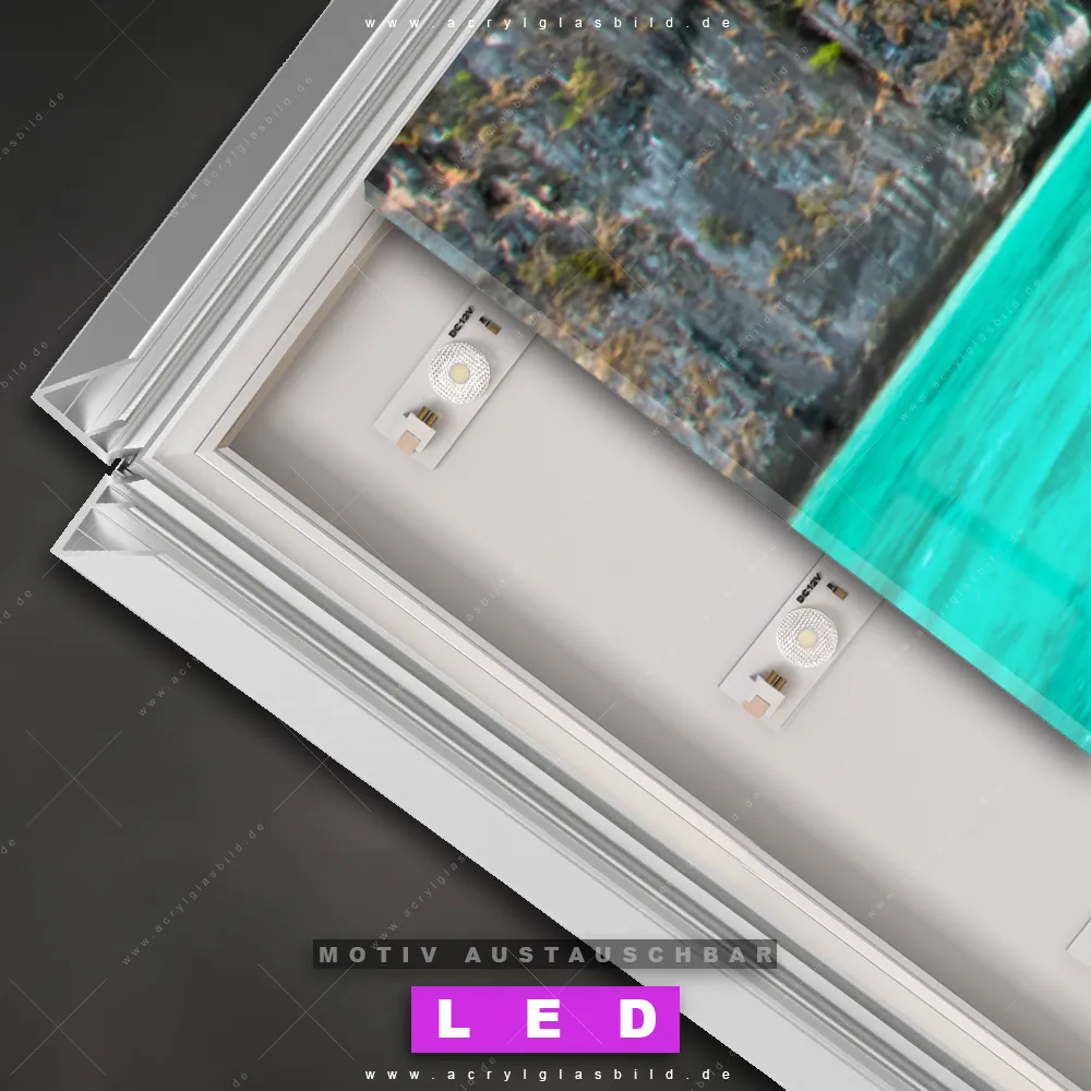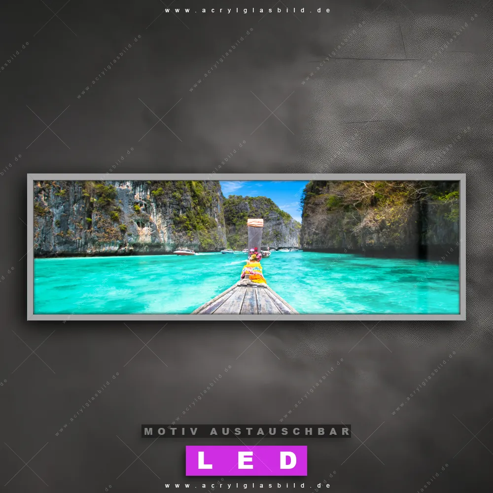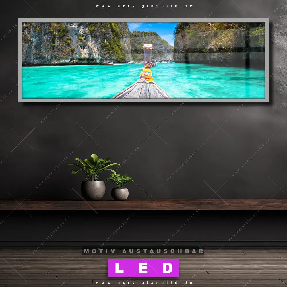 Deine Wände könnten dringend ein dimmbares LED Bild mit Fernbedienung und optionaler Farbtemperatursteuerung gebrauchen? Dann haben wir das perfekte Wandbild mit LED Beleuchtung für dich: unser mega-cooles Landschaften, Strand - Meer Canvalight® DIA LED Acrylglasbild! Mit unserem angesagten Leuchtbild aus Acrylglas im Panorama-Format und der austauschbaren bedruckten Acrylglas-Scheibe Longtail-Boot bringst du nicht nur Licht, sondern auch jede Menge Flair in deine Räume.