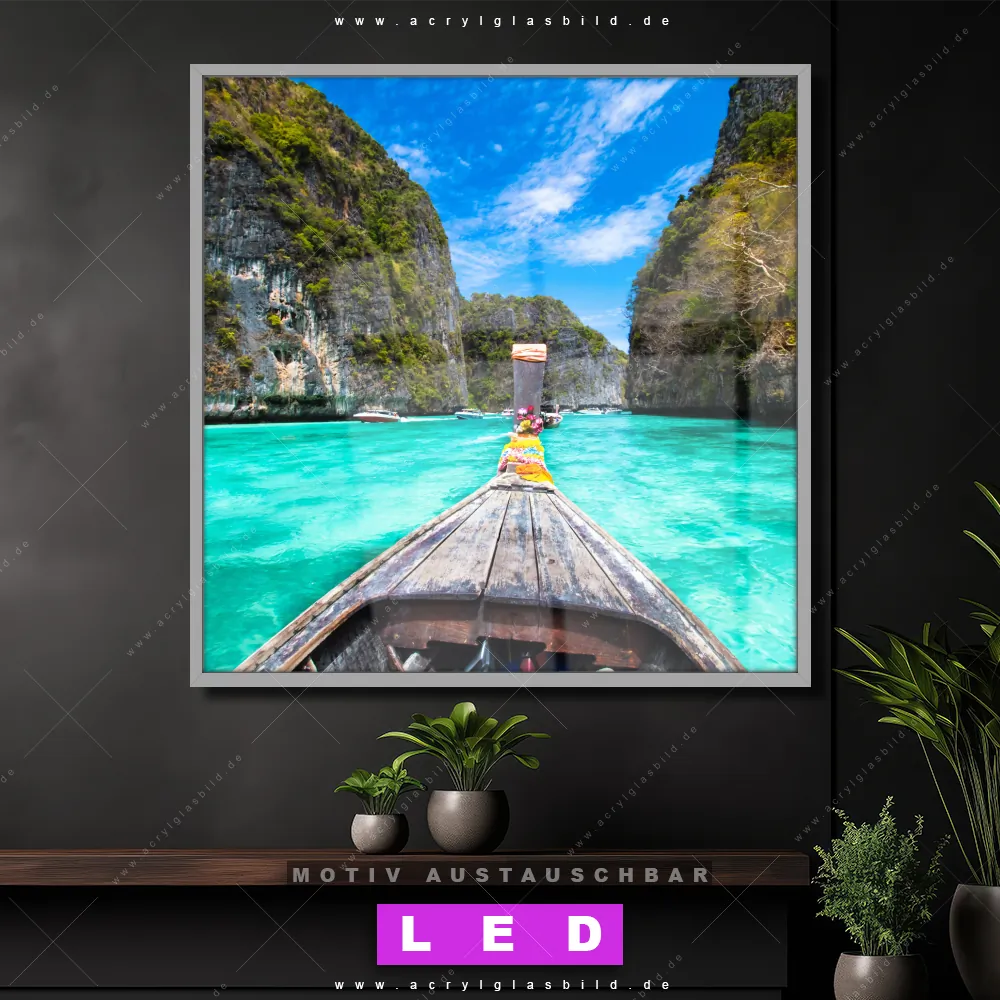 Bist du bereit, deine Wände mit einem dimmbaren LED Bild mit Fernbedienung und optionaler Farbtemperatursteuerung zum Leuchten zu bringen? Wir haben das ultimative Landschaften, Strand - Meer LED Acrylglasbild Canvalight® DIA für dich! Unser LED Wandbild aus Acrylglas Longtail-Boot im Quadratischen Format mit austauschbarer bedruckter Acrylglas-Scheibe im DIA-Klapprahmen bringt sofort jede Menge Glanz in deine vier Wände.