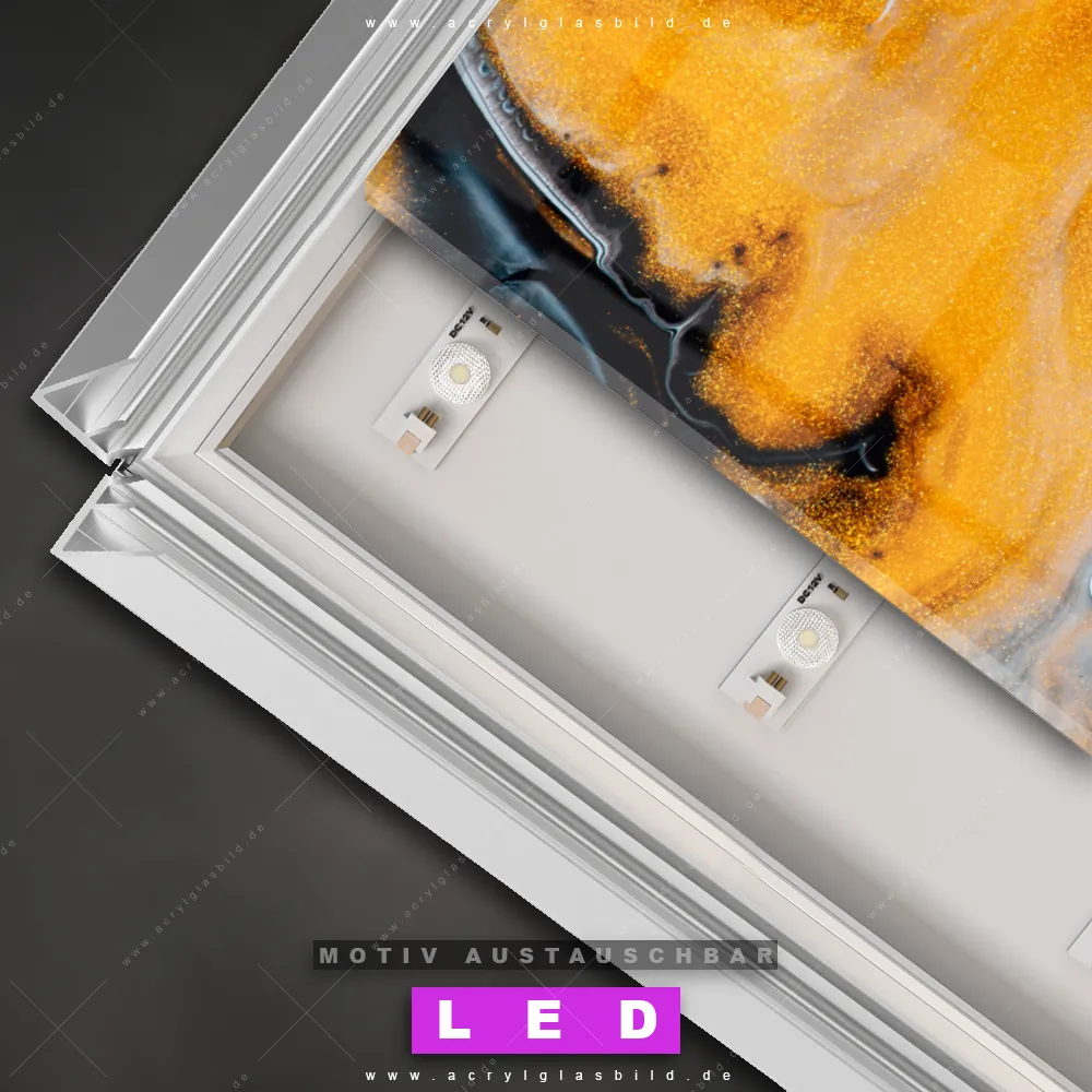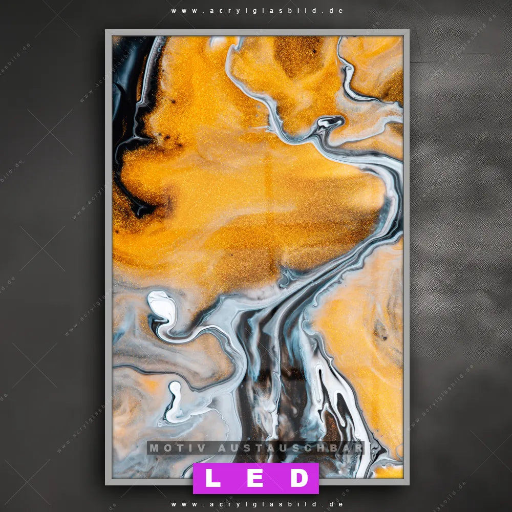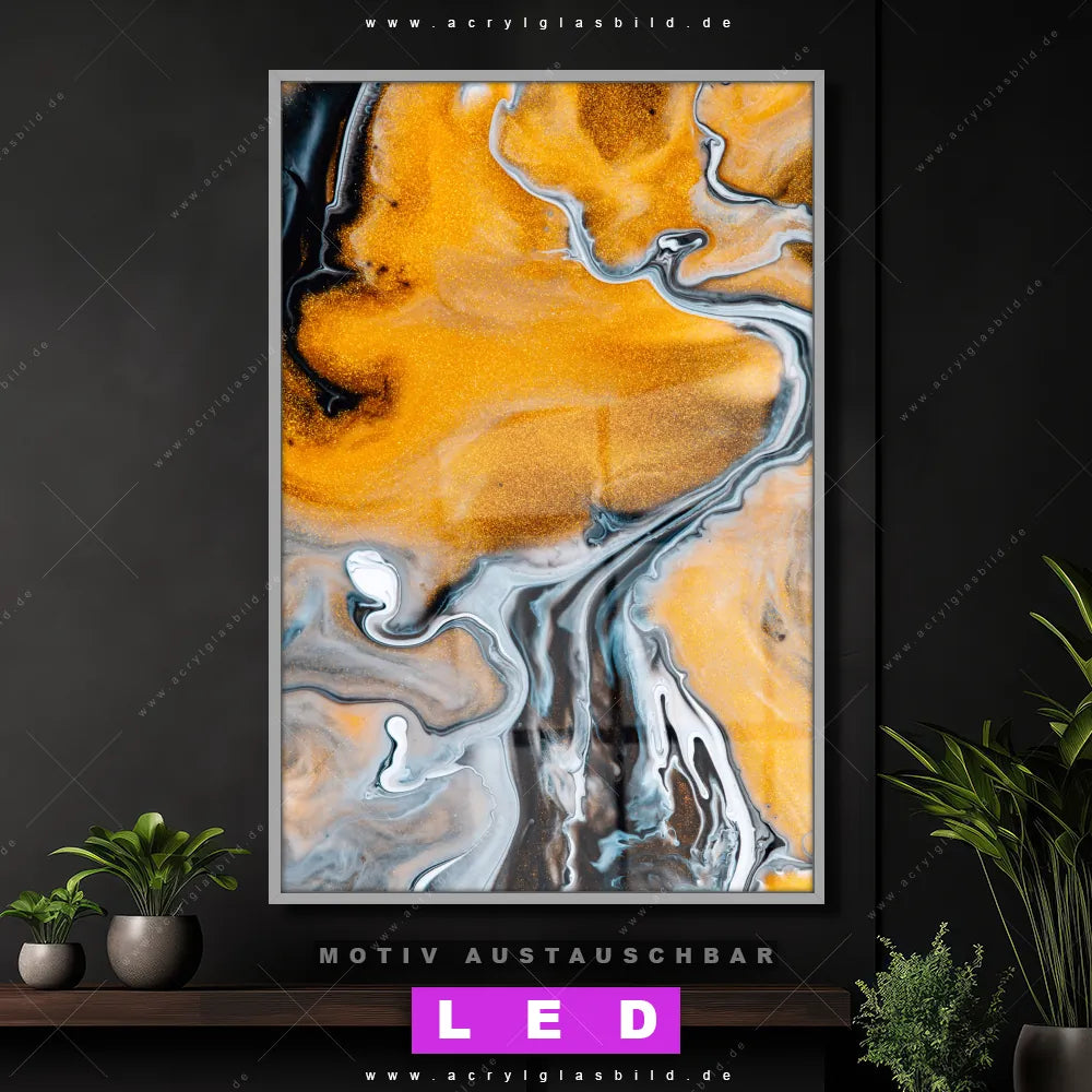 Wer braucht schon langweilige Wände, wenn man sie mit unserem LED Acrylglasbild Canvalight® DIA Fluid Painting Metalloptik aufpeppen kann? Dank der genialen LED-Ausleuchtung wirst du in Arzt - Praxis, Büro - Kanzlei, Wohnzimmer - Schlafzimmer, Bar - Gastronomie, Friseur - Beauty nie wieder über deine eigenen Füße stolpern. Wenn du nach einem beleuchteten Wandbild aus Acrylglas mit Flüssigkeit, Acryl, flüssig, Farbe, Marmorierung, Fluid Art suchst, dann ist unser LED Acrylglasbild Farbfluss metallische Farben in den hammermäßigen Motiv-Farben Schwarz, Orange, Gold, Weiss genau das richtige LED Bild für dich. Im coolen Abstrakt, Modern Art Stil gestaltet, passt das LED Leuchtbild mit DIA-Klapprahmen und glänzender Front aus Acrylglas perfekt zu jedem Einrichtungsstil – sogar zu deinem chaotischen Kreativlabor!
