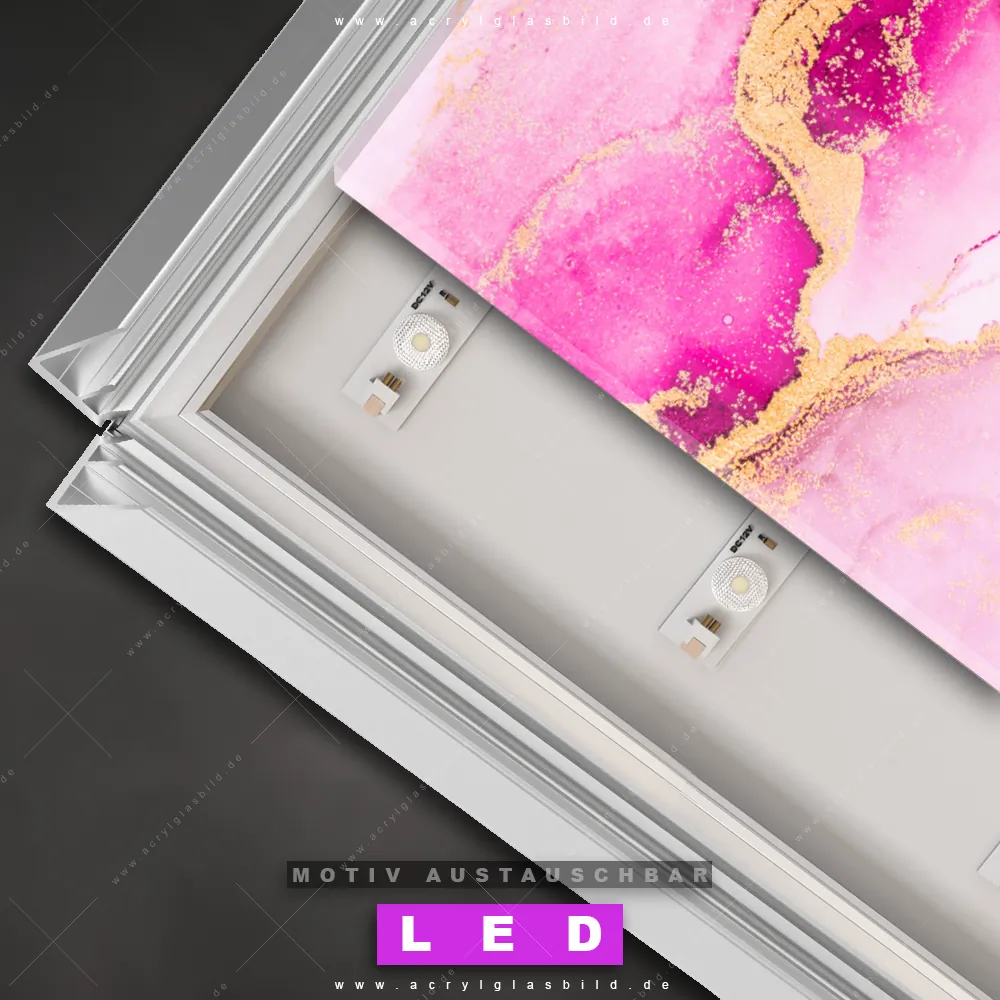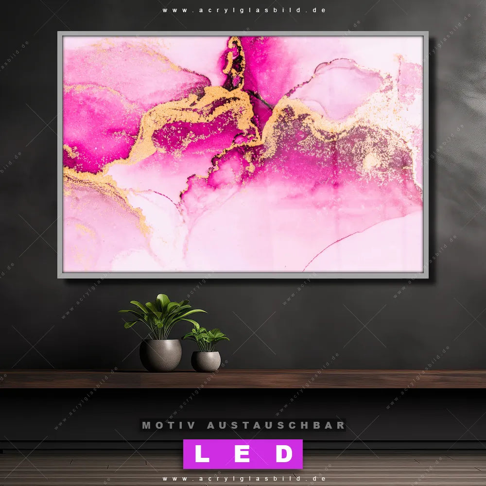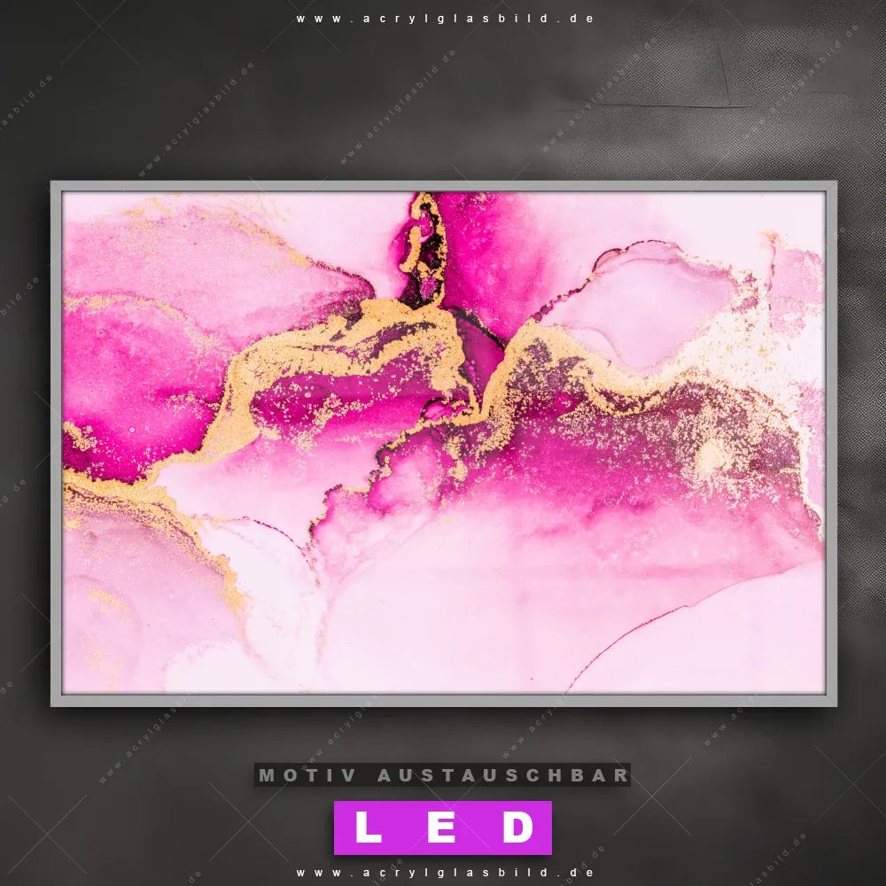 Mit unserem LED Acrylglasbild Canvalight® DIA Fluid Painting pink-gold und seiner genialen LED-Ausleuchtung wirst du nie wieder im Dunkeln auf deinem Sofa herumtappen. Wenn du nach einem beleuchteten Wandbild aus Acrylglas mit Flüssigkeit, Acryl, flüssig, Farbe, Marmorierung, Tinte, Alkohol, Fluid Art für Arzt - Praxis, Büro - Kanzlei, Wohnzimmer - Schlafzimmer, Bar - Gastronomie, Friseur - Beauty suchst, ist unser LED Leuchtbild Fluid Art Frühling in den beeindruckenden Motiv-Farben Gold, Weiss, Pink, Rosa genau das richtige beleuchtete Wandbild für dich. Gestaltet im Abstrakt, Modern Art Stil, passt dieses LED Wandbild mit DIA-Klapprahmen und glänzender Front aus Acrylglas perfekt zu jedem Einrichtungsstil – sogar zu deinem chaotischen kreativen Durcheinander!