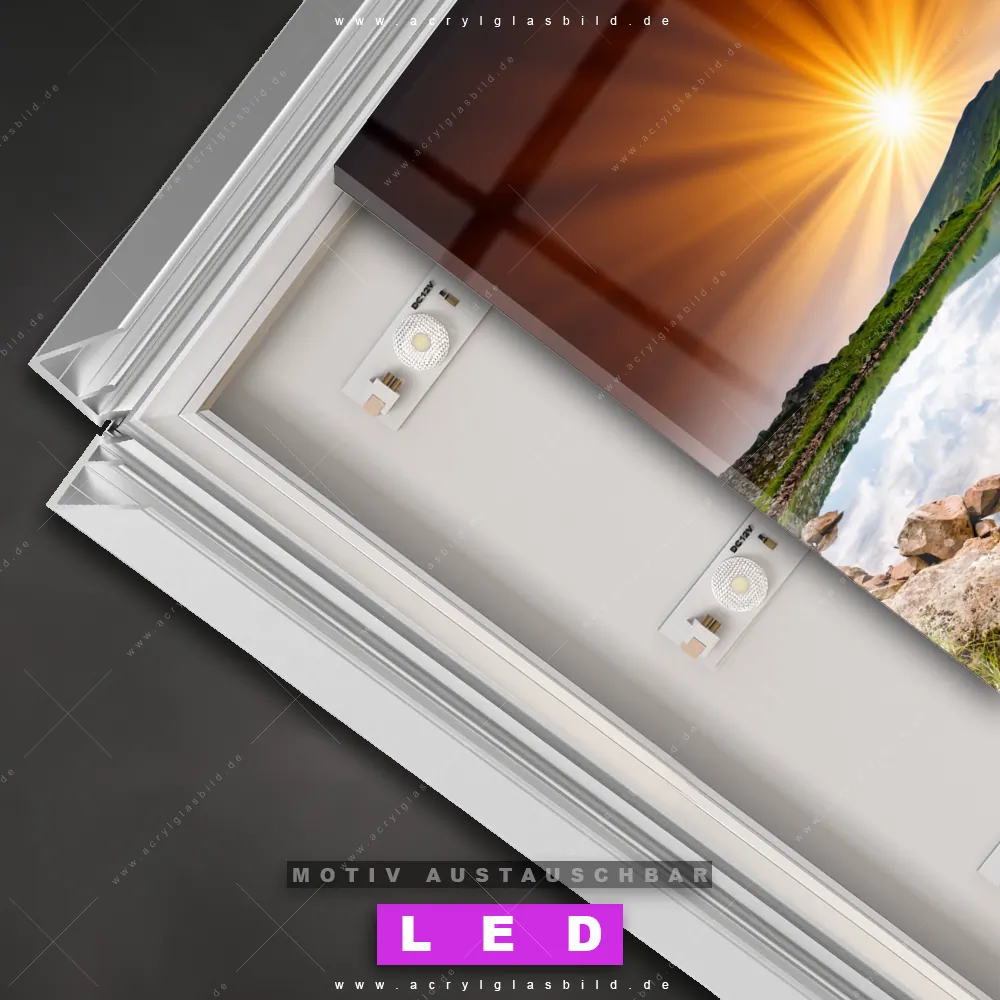 Also, worauf wartest du noch? Gib mit einem beleuchteten Wandbild mit wechselbarer Acrylglas-Scheibe deinen Wänden das gewisse Etwas und bestelle jetzt das LED Acrylglasbild Canvalight® DIA Sonnen mit kräftigen Strahlen in den Bergen – dein Zuhause wird es dir danken und deine Freunde werden dank der wechselbaren Motive erblassen!