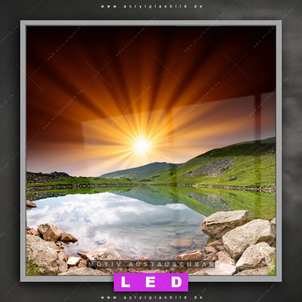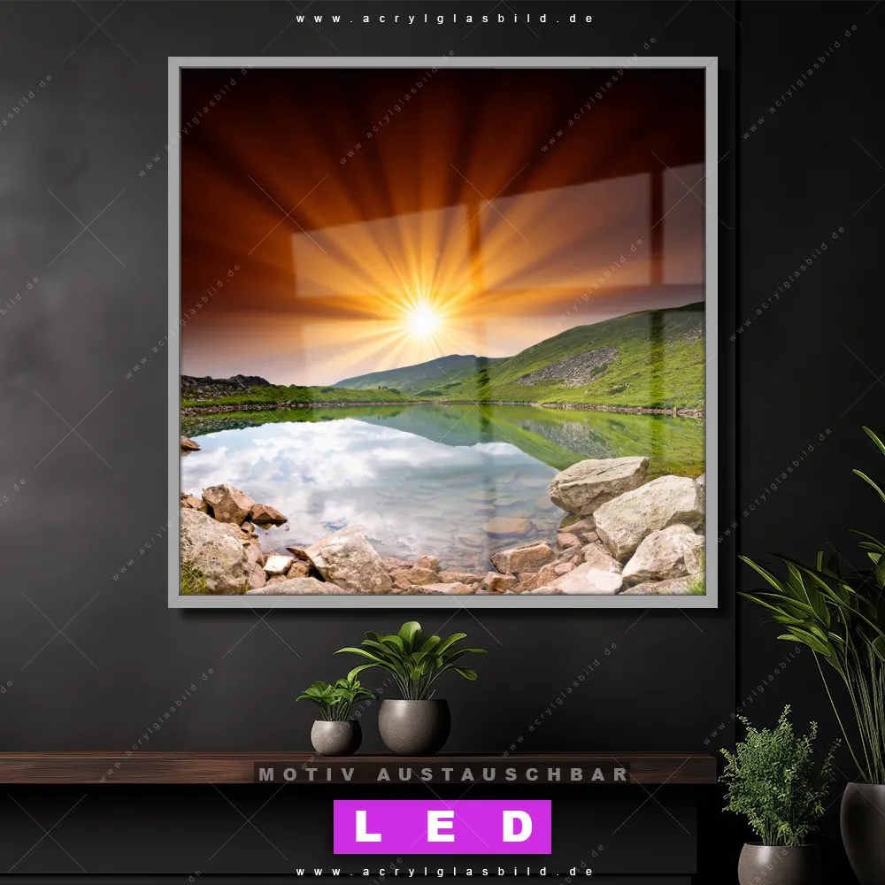 Bist du bereit, deine Wände mit einem dimmbaren LED Bild mit Fernbedienung und optionaler Farbtemperatursteuerung zum Leuchten zu bringen? Wir haben das ultimative Landschaften LED Acrylglasbild Canvalight® DIA für dich! Unser LED Wandbild aus Acrylglas Majestätischer Sonnenuntergang im Quadratischen Format mit austauschbarer bedruckter Acrylglas-Scheibe im DIA-Klapprahmen bringt sofort jede Menge Glanz in deine vier Wände.
