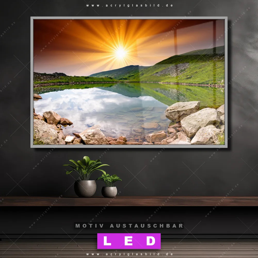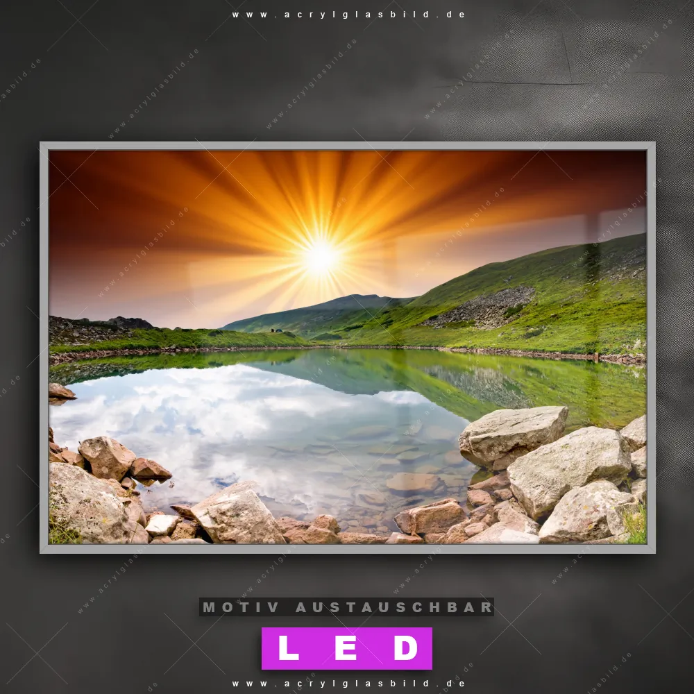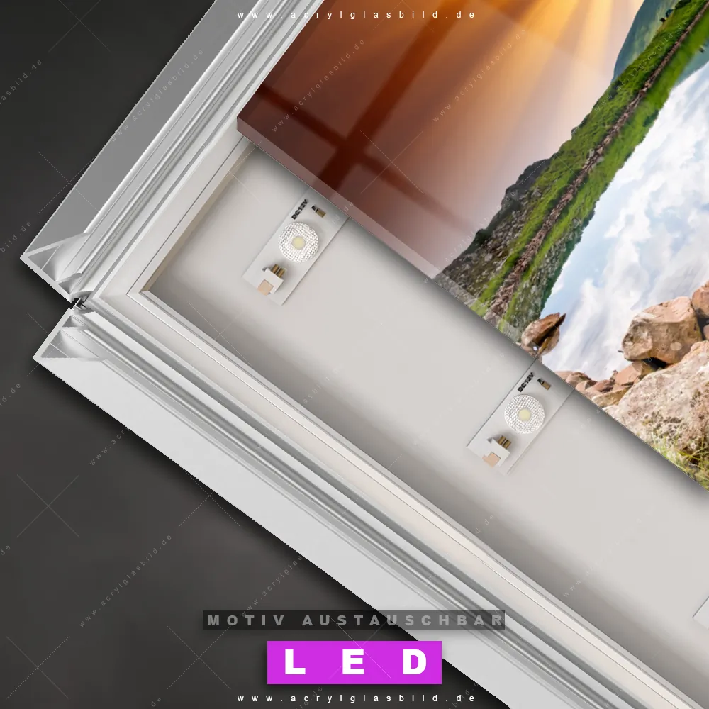 Du bist auf der Suche nach einem dimmbaren Landschaften LED Bild mit Fernbedienung und optionaler Farbtemperatursteuerung? Dann haben wir hier genau das richtige Wandbild mit LED Beleuchtung für dich: Unser Canvalight® DIA LED Acrylglasbild Majestätischer Sonnenuntergang im Querformat mit austauschbarer bedruckter Acrylglas-Scheibe. Dieses Leuchtbild bringt sofort Partybeleuchtung in deine Räume!