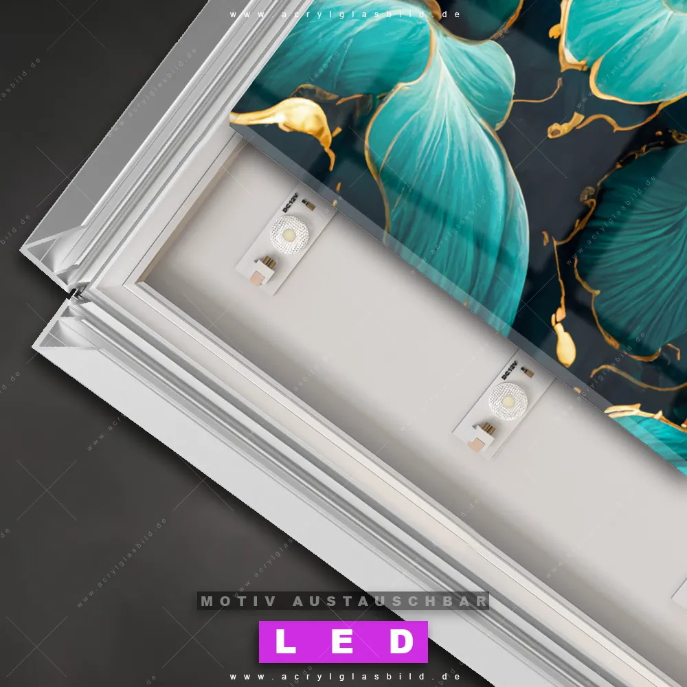 LED Acrylglasbild Canvalight® DIA | Marmor Blüten in türkis & gold | Hochformat