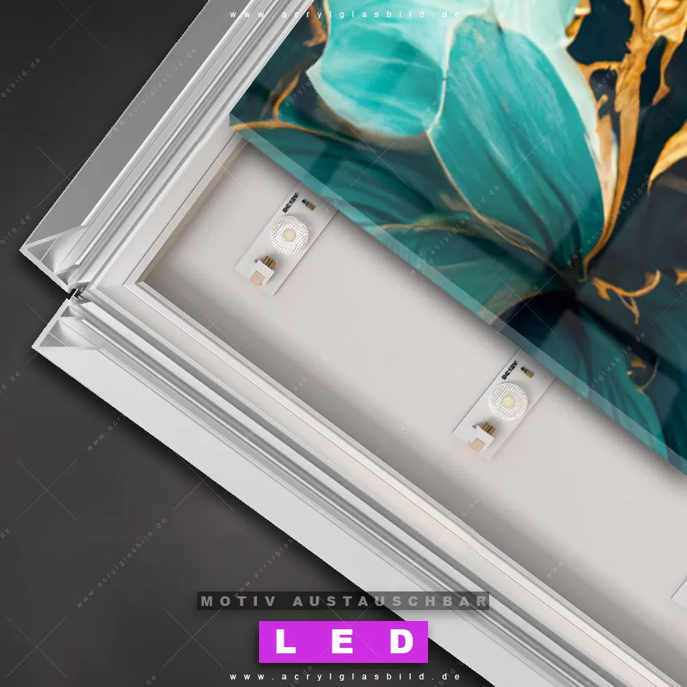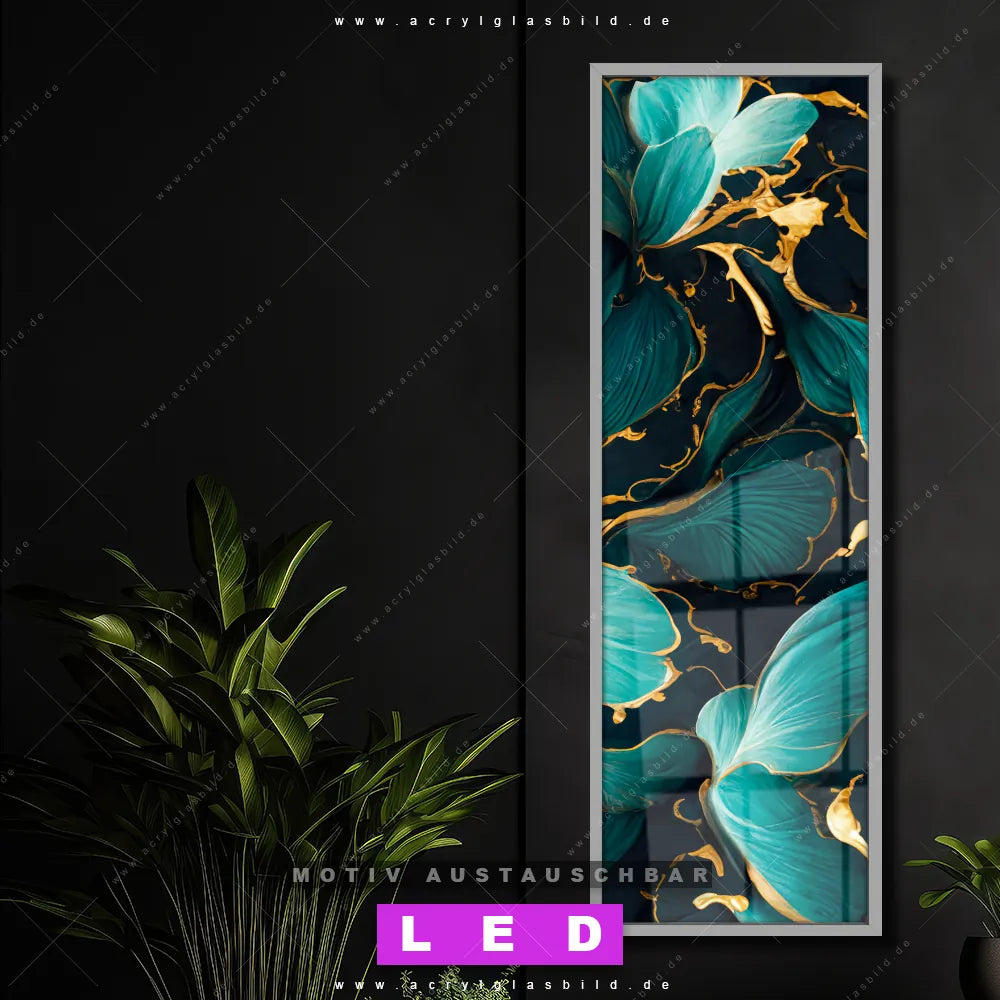 LED Acrylglasbild Canvalight® DIA | Marmor Blüten in türkis & gold | Schmal
