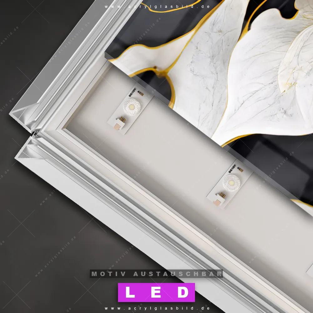 Wer braucht schon langweilige Wände, wenn man sie mit unserem LED Acrylglasbild Canvalight® DIA Blütenzauber weiß-gold aufpeppen kann? Dank der genialen LED-Ausleuchtung wirst du in Arzt - Praxis, Büro - Kanzlei, Wohnzimmer - Schlafzimmer, Bar - Gastronomie, Friseur - Beauty, Flur - Eingangsbereich nie wieder über deine eigenen Füße stolpern. Wenn du nach einem beleuchteten Wandbild aus Acrylglas mit Marmor, Flüssigkeit, Acryl, flüssig, Farbe, Marmorierung, Blumen, Blüten, Wirbel, Kunst, kreativ suchst, dann ist unser LED Acrylglasbild abstrakte Blütenvielfalt in den hammermäßigen Motiv-Farben Schwarz, Gold, Weiss genau das richtige LED Bild für dich. Im coolen Abstrakt, Modern Art, Floral Stil gestaltet, passt das LED Leuchtbild mit DIA-Klapprahmen und glänzender Front aus Acrylglas perfekt zu jedem Einrichtungsstil – sogar zu deinem chaotischen Kreativlabor!