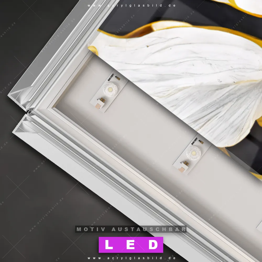 Wer will schon dunkle, triste Wände? Mit unserem LED Acrylglasbild Canvalight® DIA Blütenzauber weiß-gold und seiner fantastischen LED-Ausleuchtung werden deine Wände in Arzt - Praxis, Büro - Kanzlei, Wohnzimmer - Schlafzimmer, Bar - Gastronomie, Friseur - Beauty, Flur - Eingangsbereich zu echten Hinguckern. Wenn du auf der Suche nach einem beleuchteten Wandbild aus Acrylglas mit Marmor, Flüssigkeit, Acryl, flüssig, Farbe, Marmorierung, Blumen, Blüten, Wirbel, Kunst, kreativ bist, dann solltest du unser LED Leuchhtbild abstrakte Blütenvielfalt mit den beeindruckenden Motiv-Farben Schwarz, Gold, Weiss nicht verpassen. Gestaltet im angesagten Abstrakt, Modern Art, Floral Stil, passt das LED Bild mit DIA-Klapprahmen und wechselbarer Acrylglas-Scheibe perfekt zu jedem Einrichtungsstil – selbst in deinem kleinen Dschungel aus Kreativität und Chaos!