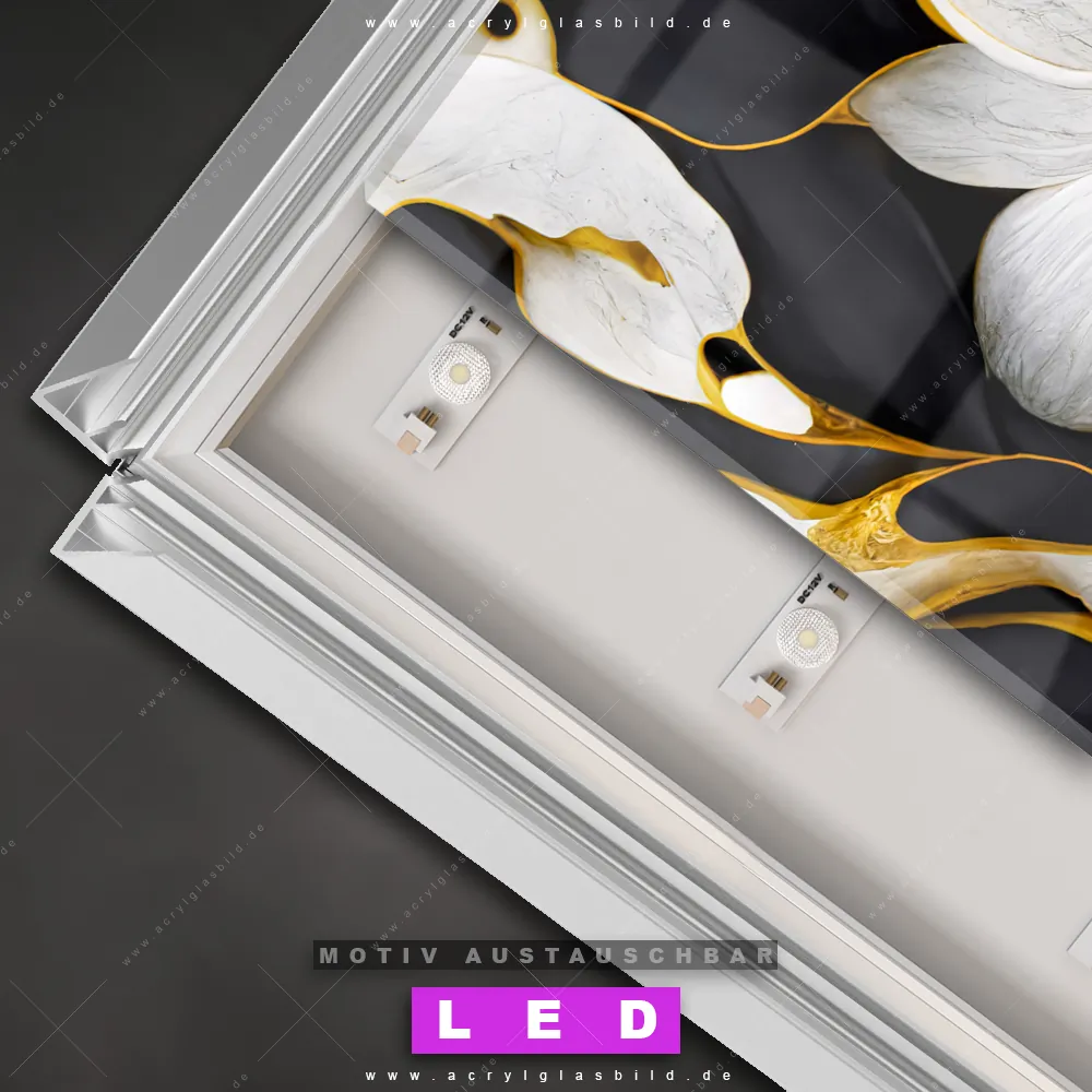 Bist du bereit, deine Wände mit einem dimmbaren LED Bild mit Fernbedienung und optionaler Farbtemperatursteuerung zum Leuchten zu bringen? Wir haben das ultimative Muster - Texturen, Blumen - Botanik LED Acrylglasbild Canvalight® DIA für dich! Unser LED Wandbild aus Acrylglas Marmor Blüten in weiß & gold im Quadratischen Format mit austauschbarer bedruckter Acrylglas-Scheibe im DIA-Klapprahmen bringt sofort jede Menge Glanz in deine vier Wände.