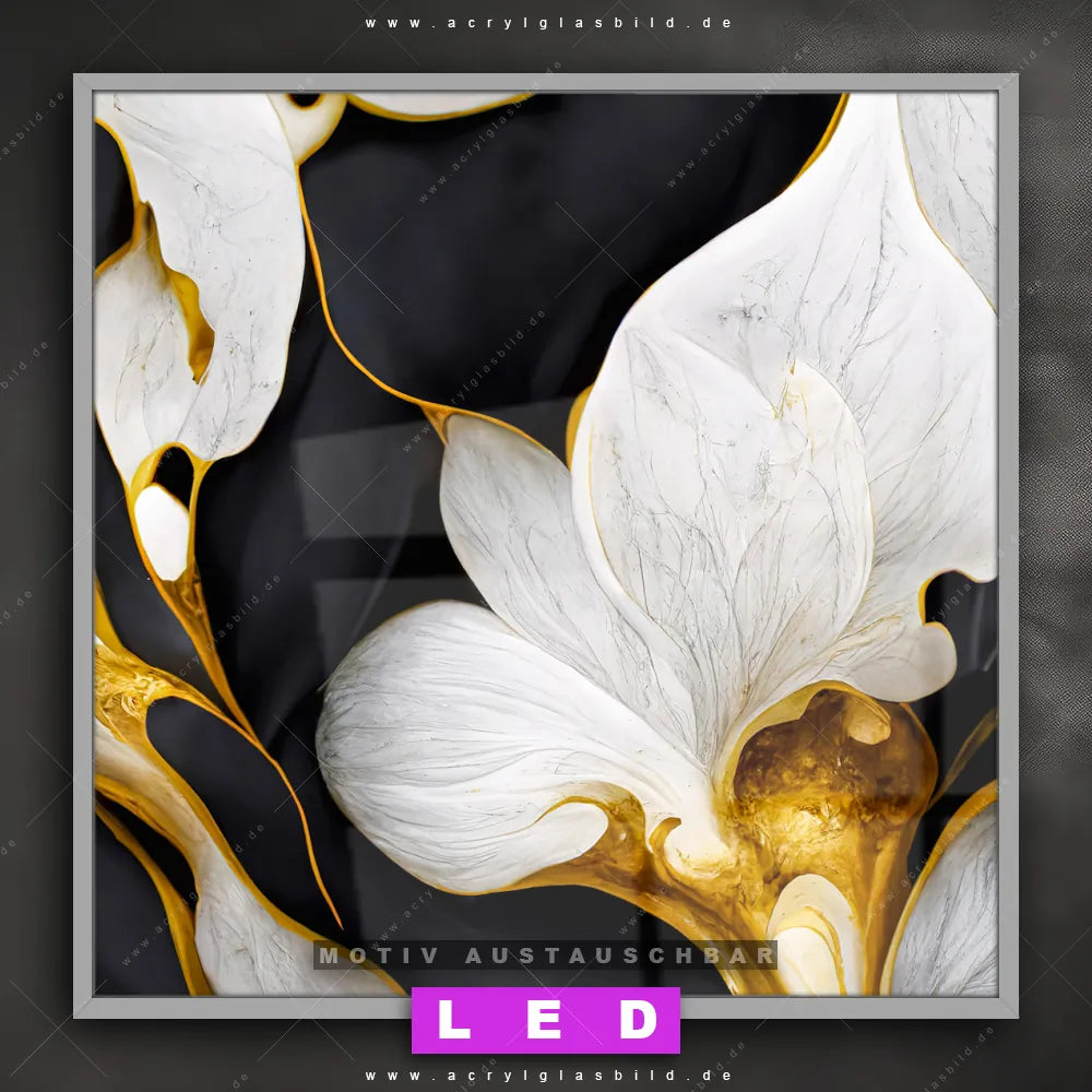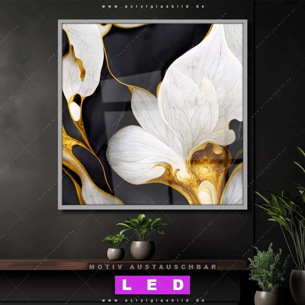 Vergiss dunkle Ecken und Langeweile! Mit unserem Acrylglasbild Blütenzauber weiß-gold und seiner brillanten LED-Ausleuchtung wirst du dich nie wieder in der Dunkelheit verirren. Wenn du auf der Suche nach einem beleuchteten Wandbild aus Acrylglas mit Marmor, Flüssigkeit, Acryl, flüssig, Farbe, Marmorierung, Blumen, Blüten, Wirbel, Kunst, kreativ bist, ist unser LED Acrylglasbild Canvalight® DIA abstrakte Blütenvielfalt mit den strahlenden Motiv-Farben Schwarz, Gold, Weiss genau das richtige Leuchtbild für dich. Das im Abstrakt, Modern Art, Floral Stil gestaltete LED Bild mit glänzender Front aus Acrylglas passt perfekt zu jedem Einrichtungsstil in Arzt - Praxis, Büro - Kanzlei, Wohnzimmer - Schlafzimmer, Bar - Gastronomie, Friseur - Beauty, Flur - Eingangsbereich – vom minimalistischen Chic bis zum kreativen Chaos.