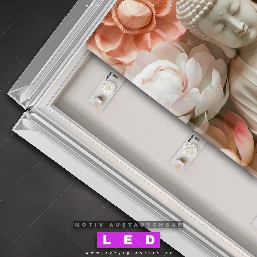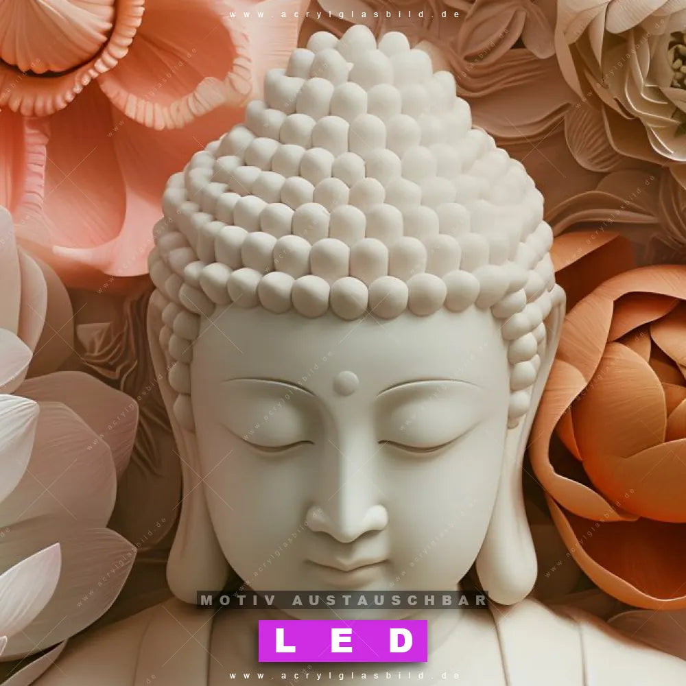 Du suchst nach einem Wandbild mit LED Beleuchtung als ultimativen Hingucker für deine Wände? Dann haben wir das perfekte dimmbare LED Bild mit Fernbedienung und optionaler Farbtemperatursteuerung für dich: unser abgefahrenes Buddha - Feng Shui, Blumen - Botanik Canvalight® DIA LED Acrylglasbild! Mit dem LED Leuchtbild aus Acrylglas Meditierender Buddha mit Blüten im Hochformat mit austauschbarer bedruckter Acrylglas-Scheibe bringst du nicht nur Licht, sondern auch ordentlich Stil in deine Bude.