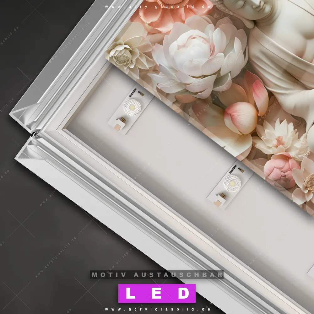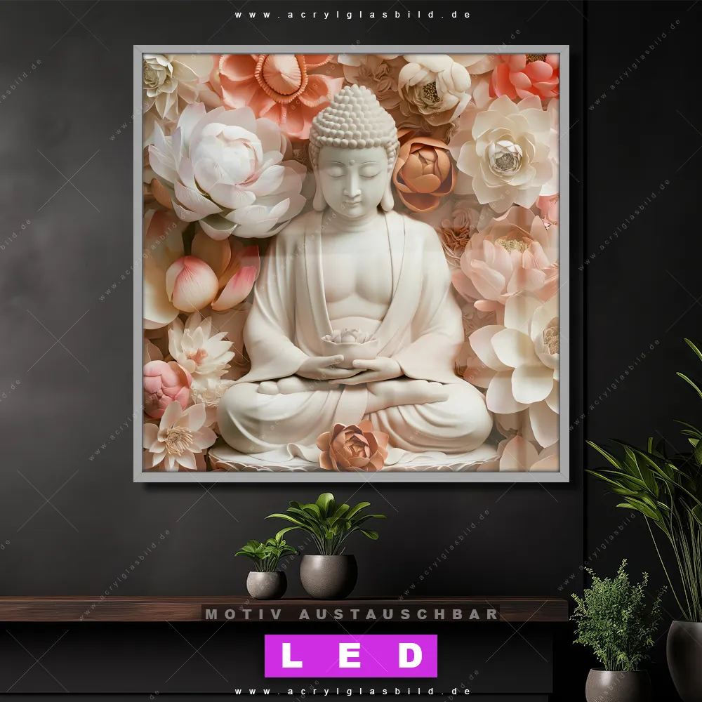 Bist du bereit, deine Wände mit einem dimmbaren LED Bild mit Fernbedienung und optionaler Farbtemperatursteuerung zum Leuchten zu bringen? Wir haben das ultimative Buddha - Feng Shui, Blumen - Botanik LED Acrylglasbild Canvalight® DIA für dich! Unser LED Wandbild aus Acrylglas Meditierender Buddha mit Blüten im Quadratischen Format mit austauschbarer bedruckter Acrylglas-Scheibe im DIA-Klapprahmen bringt sofort jede Menge Glanz in deine vier Wände.