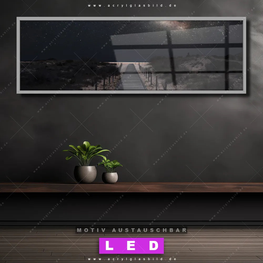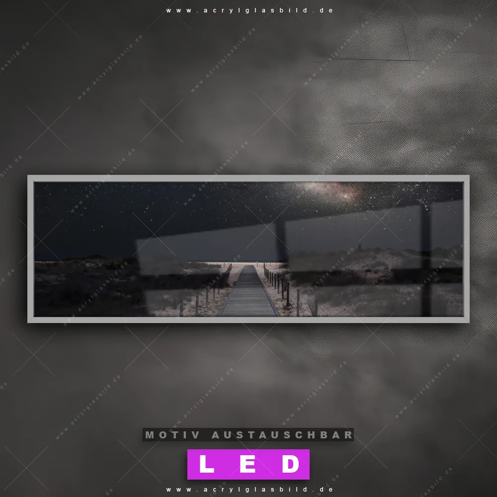 Deine Wände könnten dringend ein dimmbares LED Bild mit Fernbedienung und optionaler Farbtemperatursteuerung gebrauchen? Dann haben wir das perfekte Wandbild mit LED Beleuchtung für dich: unser mega-cooles Landschaften, Strand - Meer Canvalight® DIA LED Acrylglasbild! Mit unserem angesagten Leuchtbild aus Acrylglas im Panorama-Format und der austauschbaren bedruckten Acrylglas-Scheibe Milchstraße über einem Holzweg bringst du nicht nur Licht, sondern auch jede Menge Flair in deine Räume.