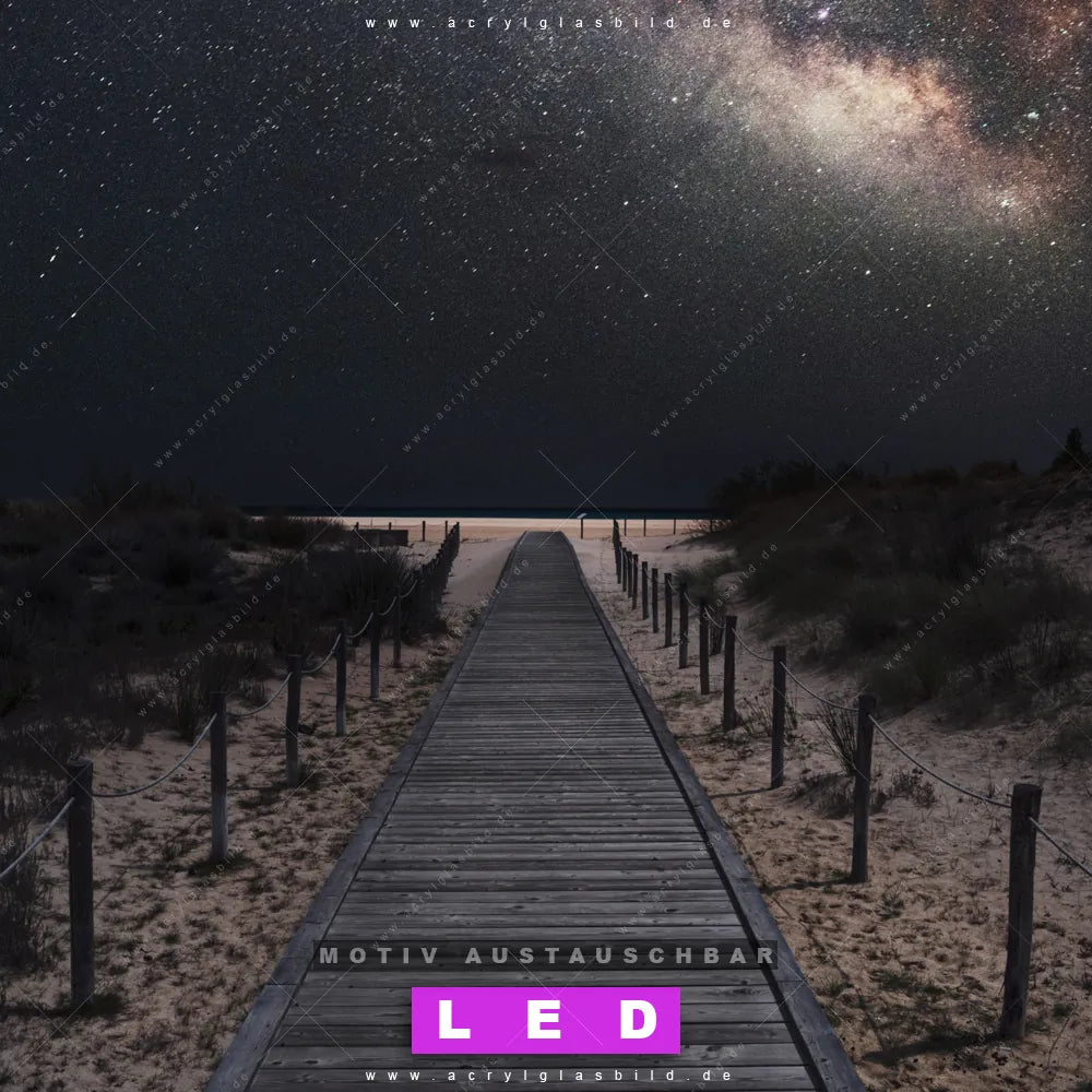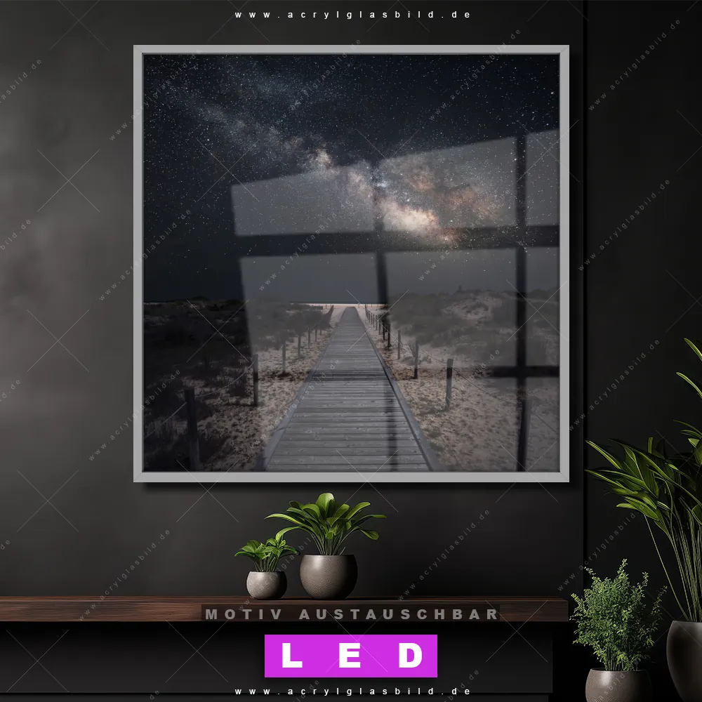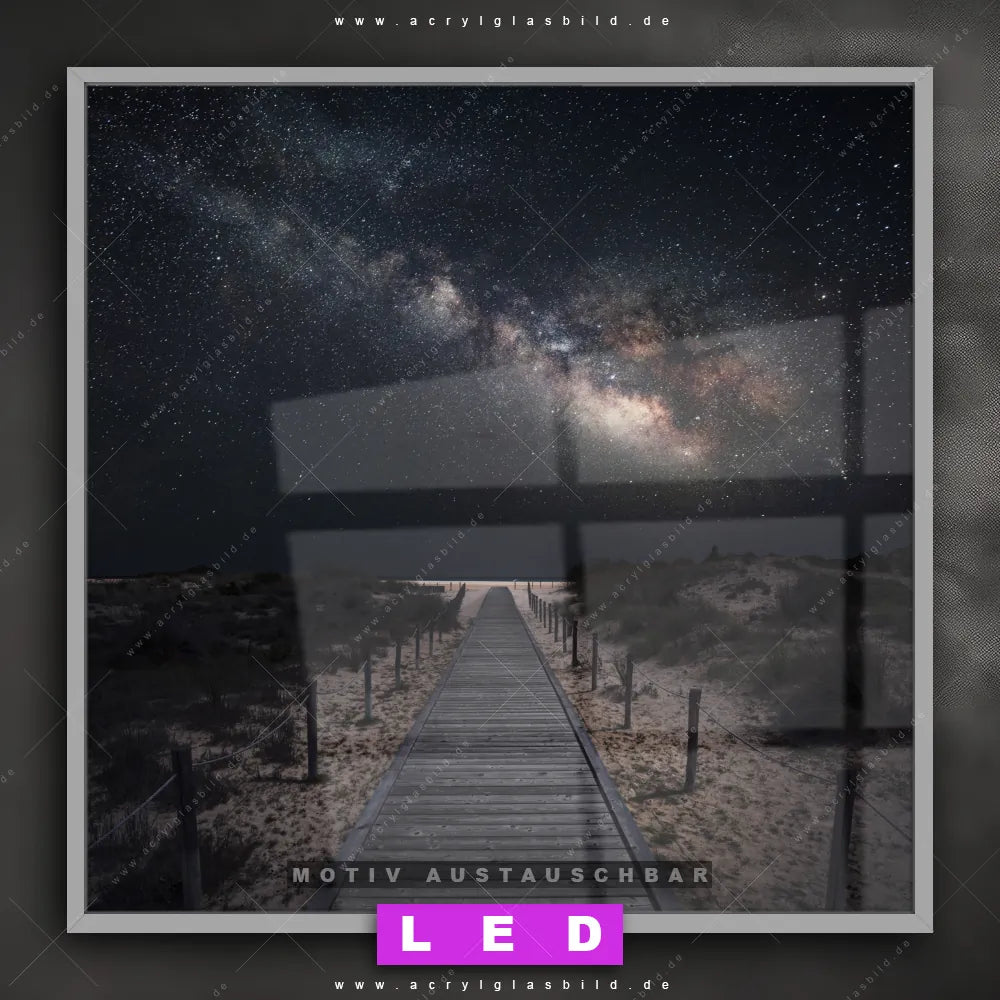 Bist du bereit, deine Wände mit einem dimmbaren LED Bild mit Fernbedienung und optionaler Farbtemperatursteuerung zum Leuchten zu bringen? Wir haben das ultimative Landschaften, Strand - Meer LED Acrylglasbild Canvalight® DIA für dich! Unser LED Wandbild aus Acrylglas Milchstraße über einem Holzweg im Quadratischen Format mit austauschbarer bedruckter Acrylglas-Scheibe im DIA-Klapprahmen bringt sofort jede Menge Glanz in deine vier Wände.