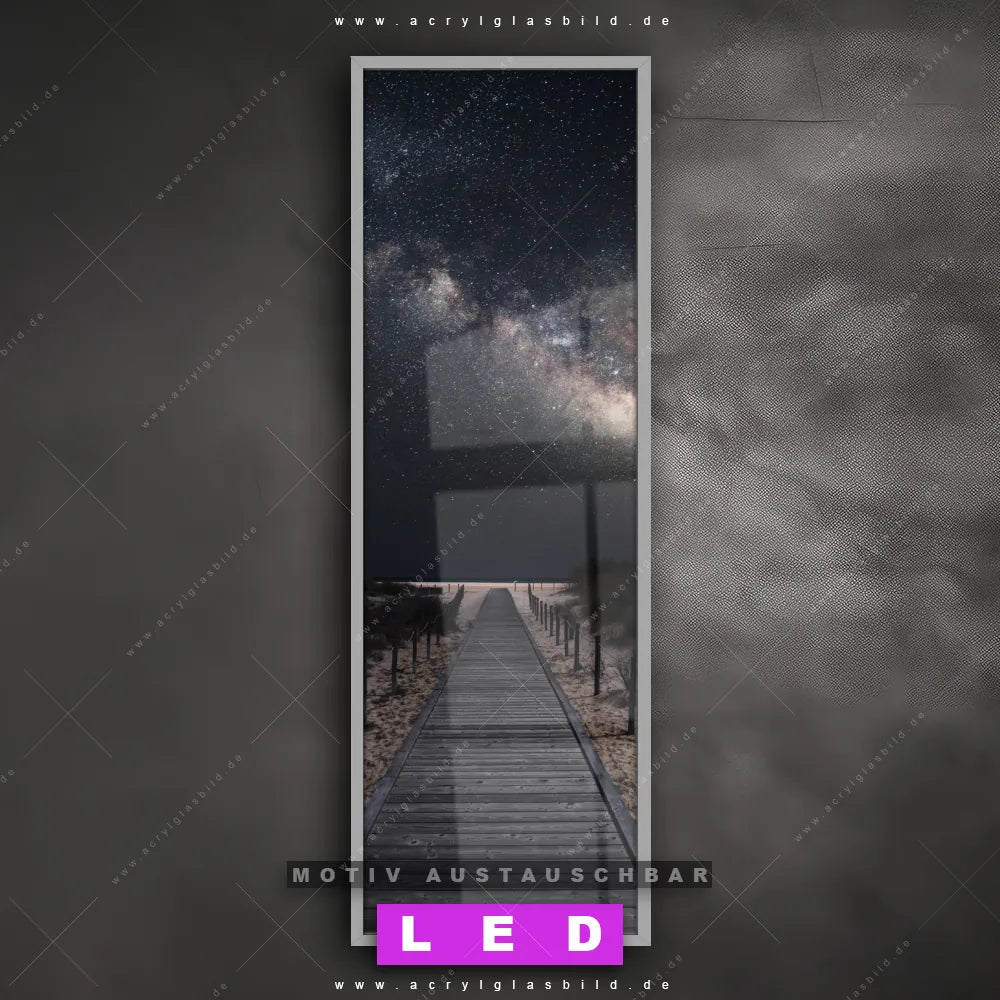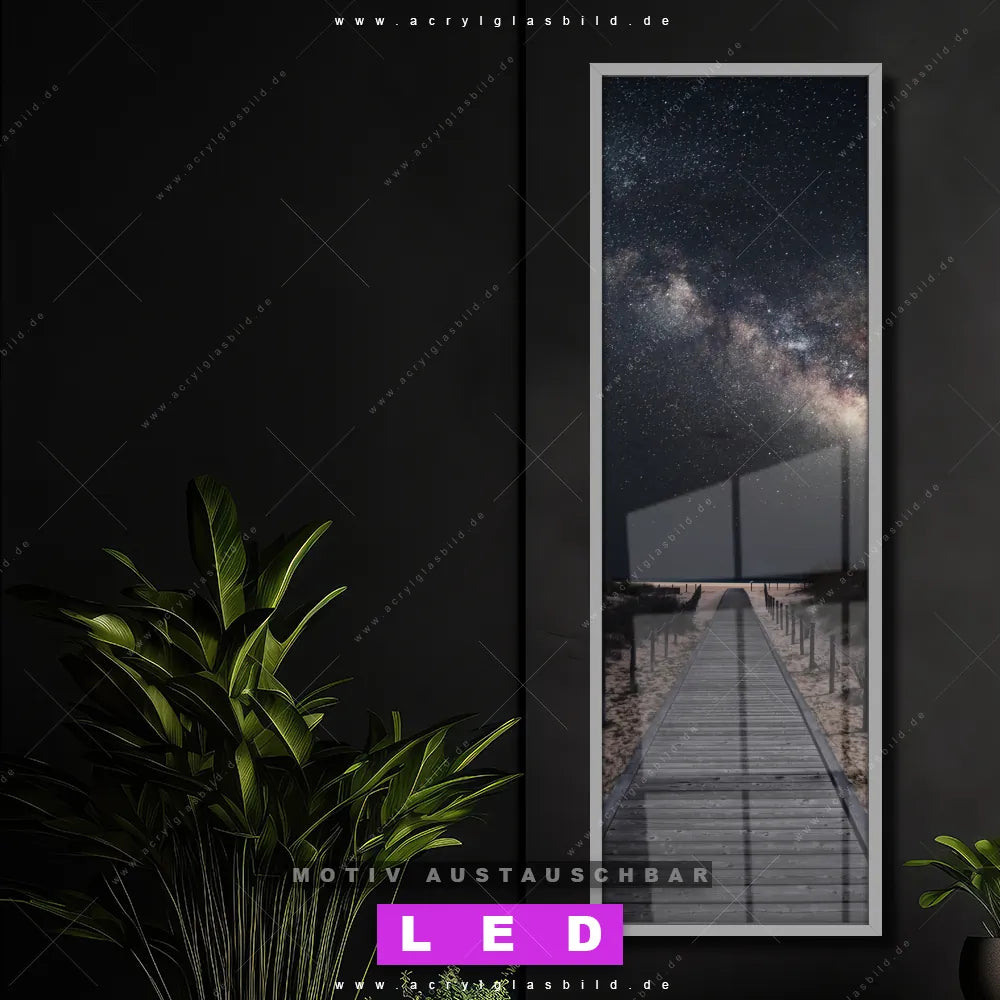 Bist du bereit, deine Wände mit einem dimmbaren LED Bild mit Fernbedienung und optionaler Farbtemperatursteuerung auf das nächste Level zu bringen? Unser Landschaften, Strand - Meer Canvalight® DIA LED Acrylglasbild ist genau das, was du brauchst! Das Wandbild mit LED Beleuchtung im Schmalen Format mit austauschbarer bedruckter Acrylglas-Scheibe Milchstraße über einem Holzweg bringt Licht und Stil in dein Zuhause – und das in null Komma nichts!