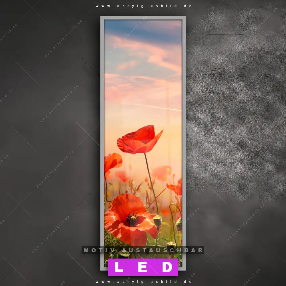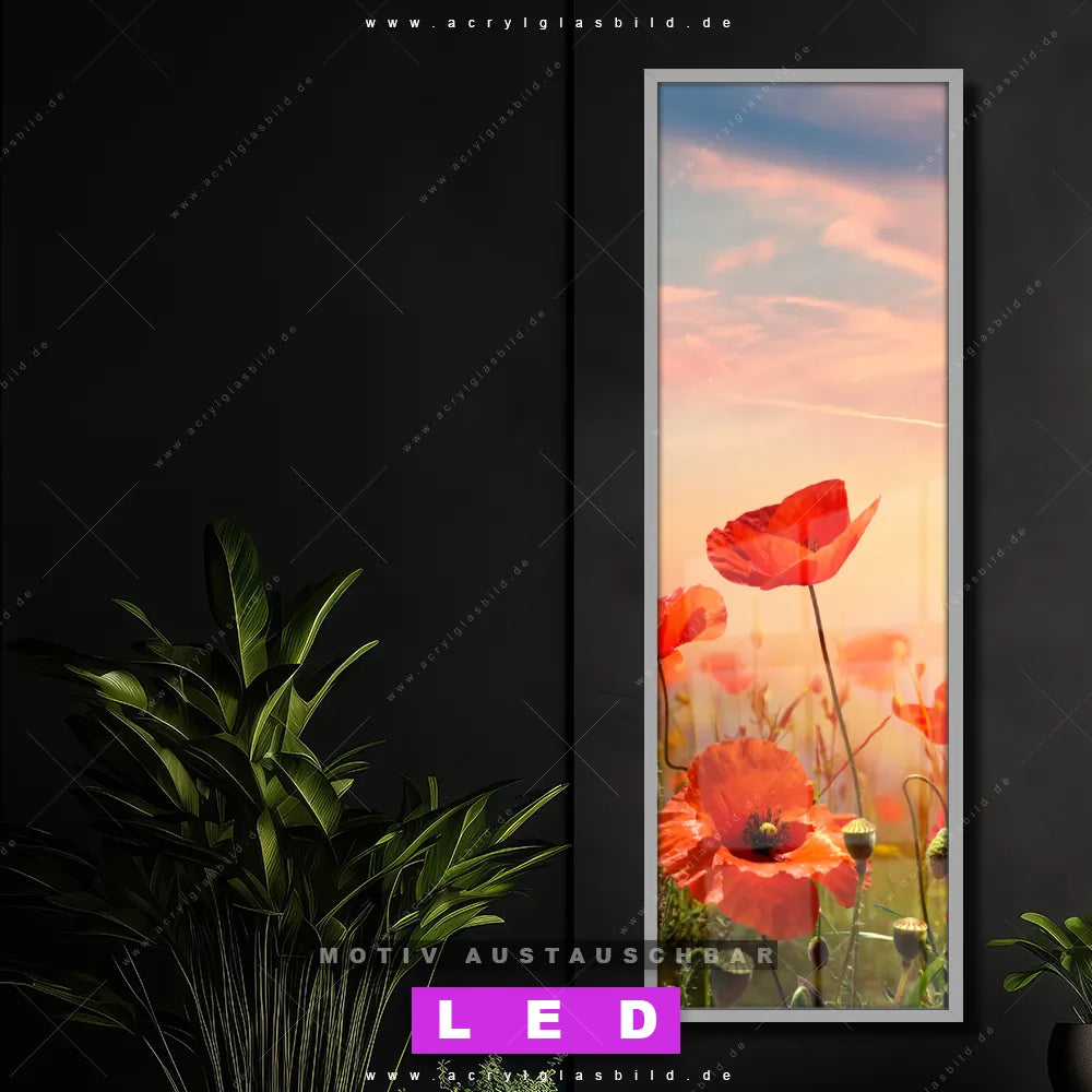 Bist du bereit, deine Wände mit einem dimmbaren LED Bild mit Fernbedienung und optionaler Farbtemperatursteuerung auf das nächste Level zu bringen? Unser Landschaften, Blumen - Botanik Canvalight® DIA LED Acrylglasbild ist genau das, was du brauchst! Das Wandbild mit LED Beleuchtung im Schmalen Format mit austauschbarer bedruckter Acrylglas-Scheibe Mohnblumenfeld bei Sonnenuntergang bringt Licht und Stil in dein Zuhause – und das in null Komma nichts!