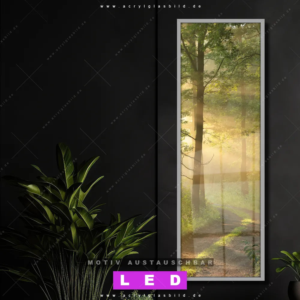 Bist du bereit, deine Wände mit einem dimmbaren LED Bild mit Fernbedienung und optionaler Farbtemperatursteuerung auf das nächste Level zu bringen? Unser Landschaften, Wald - Bäume Canvalight® DIA LED Acrylglasbild ist genau das, was du brauchst! Das Wandbild mit LED Beleuchtung im Schmalen Format mit austauschbarer bedruckter Acrylglas-Scheibe Morgenspaziergang im nebeligem Wald bringt Licht und Stil in dein Zuhause – und das in null Komma nichts!