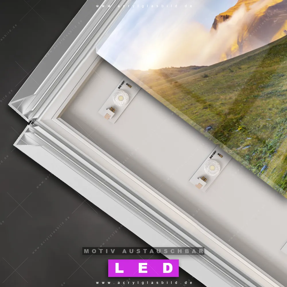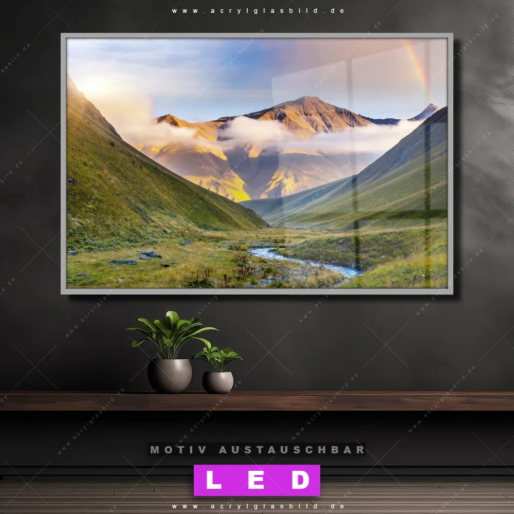 Du bist auf der Suche nach einem dimmbaren Landschaften LED Bild mit Fernbedienung und optionaler Farbtemperatursteuerung? Dann haben wir hier genau das richtige Wandbild mit LED Beleuchtung für dich: Unser Canvalight® DIA LED Acrylglasbild Nebel und Regenbogen zwischen den Bergen im Querformat mit austauschbarer bedruckter Acrylglas-Scheibe. Dieses Leuchtbild bringt sofort Partybeleuchtung in deine Räume!