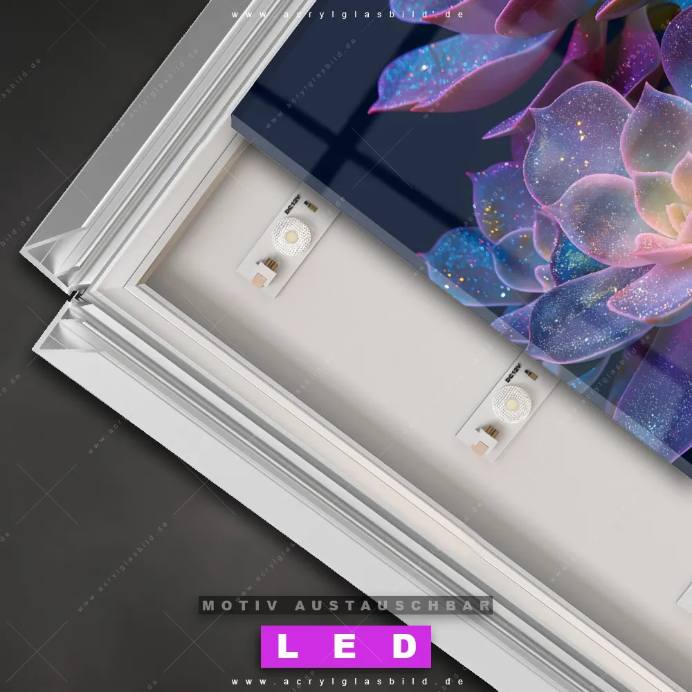Also, worauf wartest du noch? Gib mit einem beleuchteten Wandbild mit wechselbarer Acrylglas-Scheibe deinen Wänden das gewisse Etwas und bestelle jetzt das LED Acrylglasbild Canvalight® DIA Sukkulenten: Farbenspiel und Glanz – dein Zuhause wird es dir danken und deine Freunde werden dank der wechselbaren Motive erblassen!